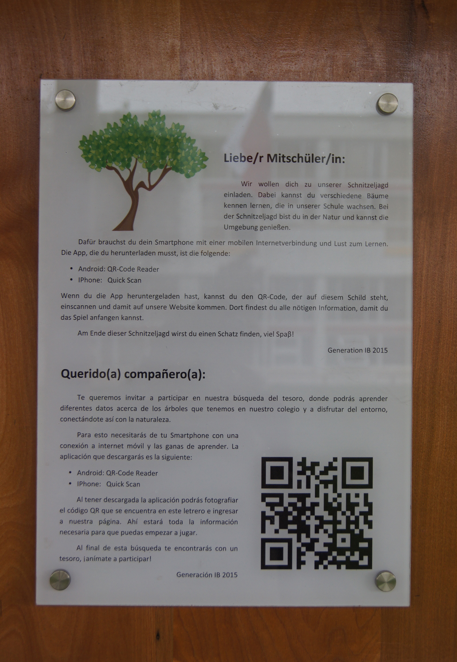 Die Schüler der IV C Claudia Toro und Angelo Romano präsentierten das neue Projekt „Schatzsuche“, das unsere IB-Schüler im Fach Biologie auf Deutsch seit dem letzten Jahr entwickelt haben. Hierfür identifizierten sie die sich auf unserem Schulgelände befindenden Baumarten und brachten an Pfosten Schilder mit den Namen jeder Baumart und einen von Handys lesbaren QR-Code an. Sie riefen die restlichen Schüler dazu auf, an dem Rundgang teilzunehmen, der mit einer Schatztruhe endet. (Weitere Informationen unter: https://www.dsvaldivia.cl/schatzsuche-interdisziplinares-projekt-der-iv-c-2015/).