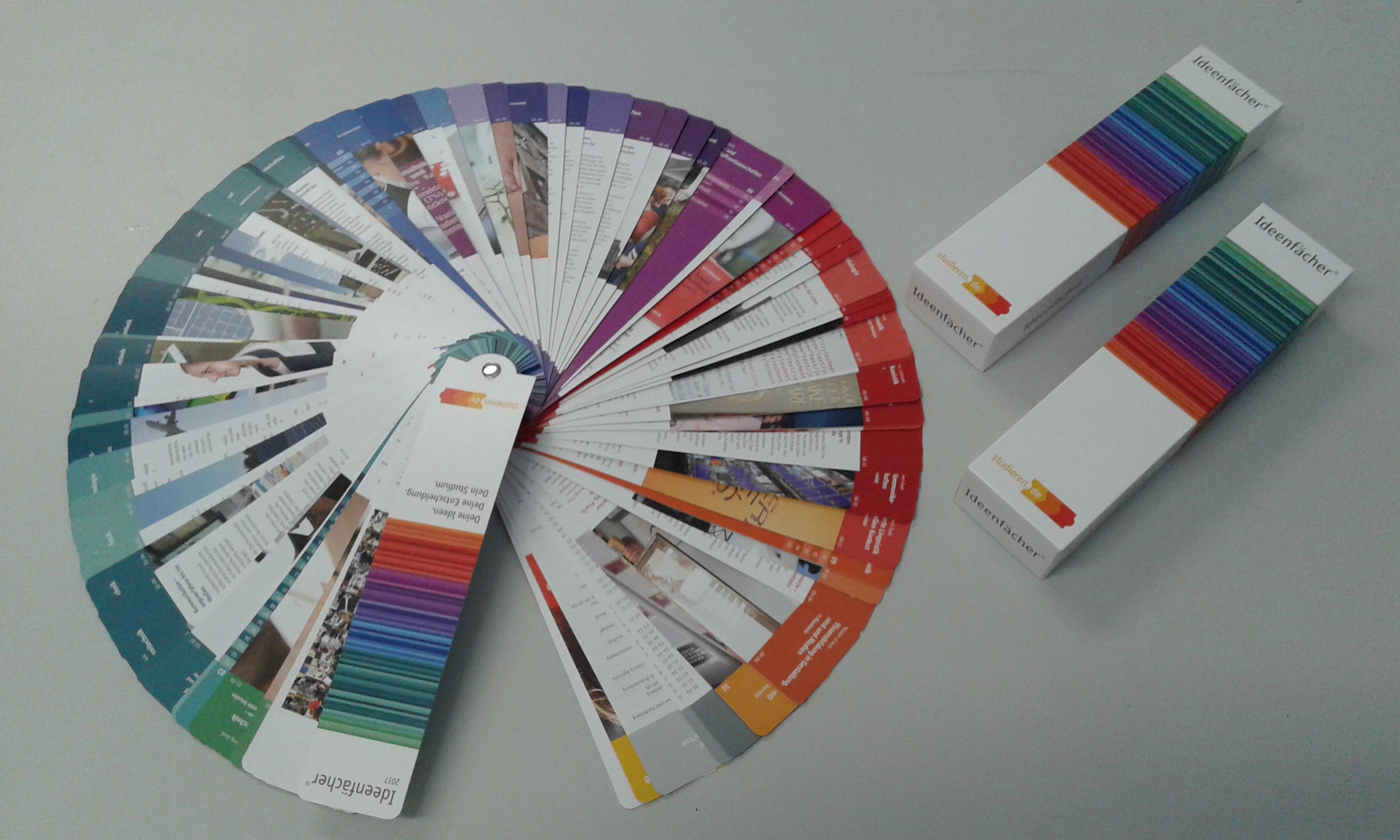 Los abanicos de ideas son un muestrario con 480 páginas de temas dedicados a la formación académica en Alemania. En ese país hay casi 19 mil carreras en una gran diversidad de sectores, y el abanico les muestra un espectro completo de los temas académicos, como una manera de entregar un impulso en la orientación vocacional y profesional para que puedan decidir con conocimiento o abordar carreras diferentes a hora de elegir el área en la que se desean desarrollar.