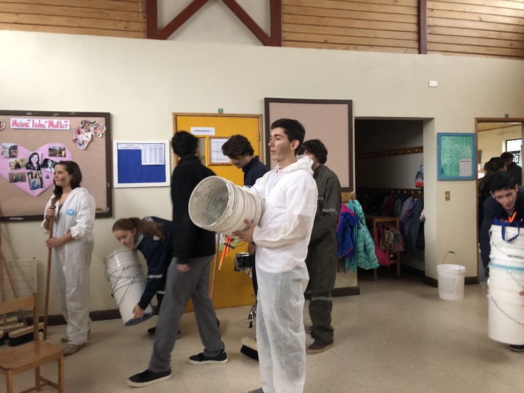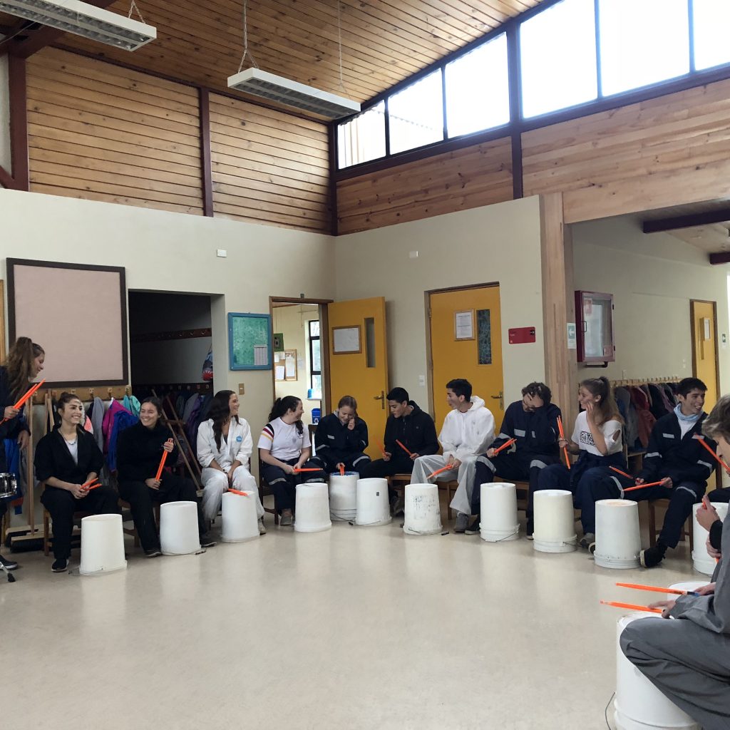 Mostraron a sus compañeros de Kindergarten dos cuadros de percusión: una batucada y un esquema con escobas, basados en el grupo Stomp, conjunto británico que se dedica a la expresión musical a través de la percusión, el movimiento corporal y la comedia visual.