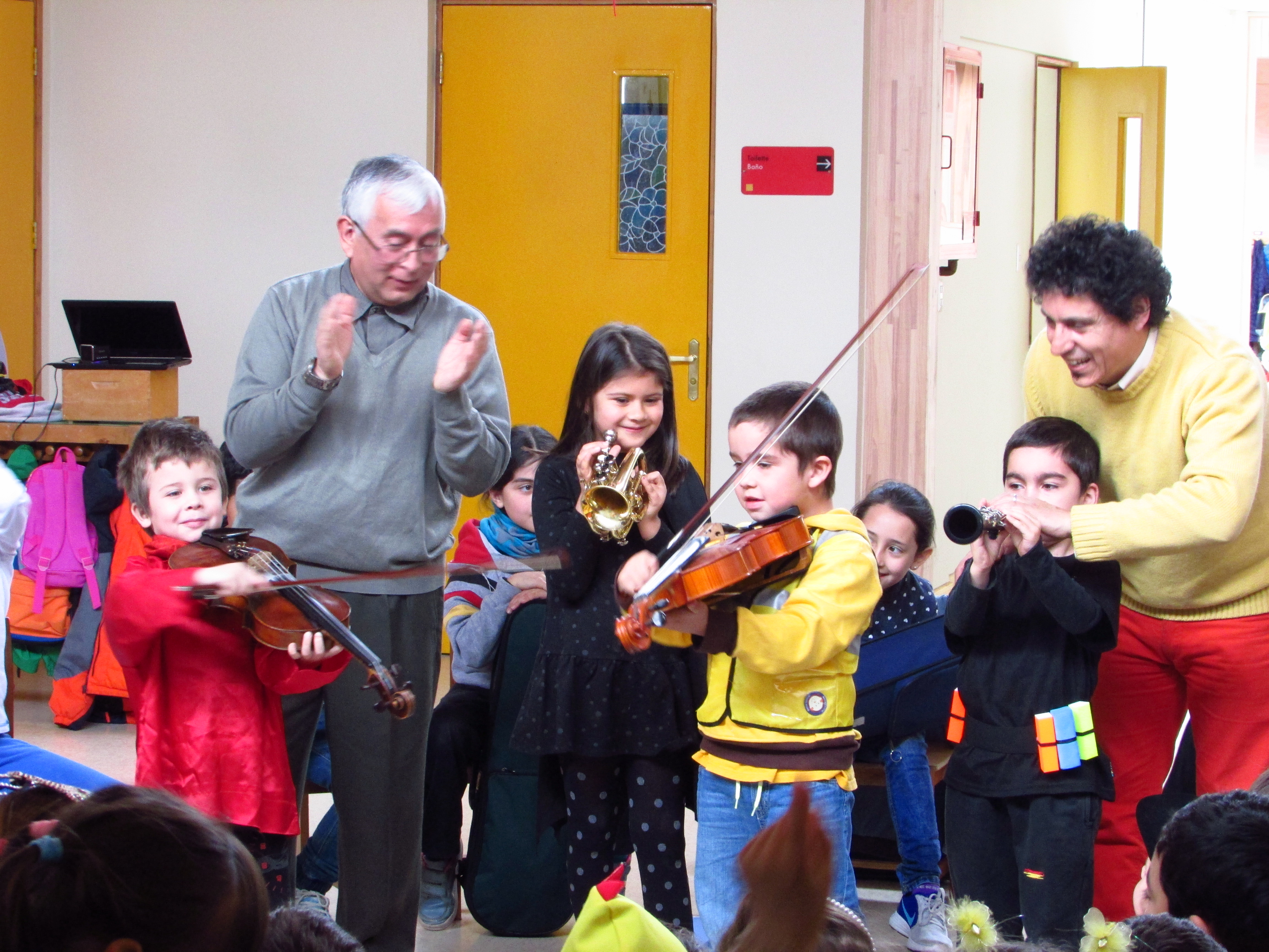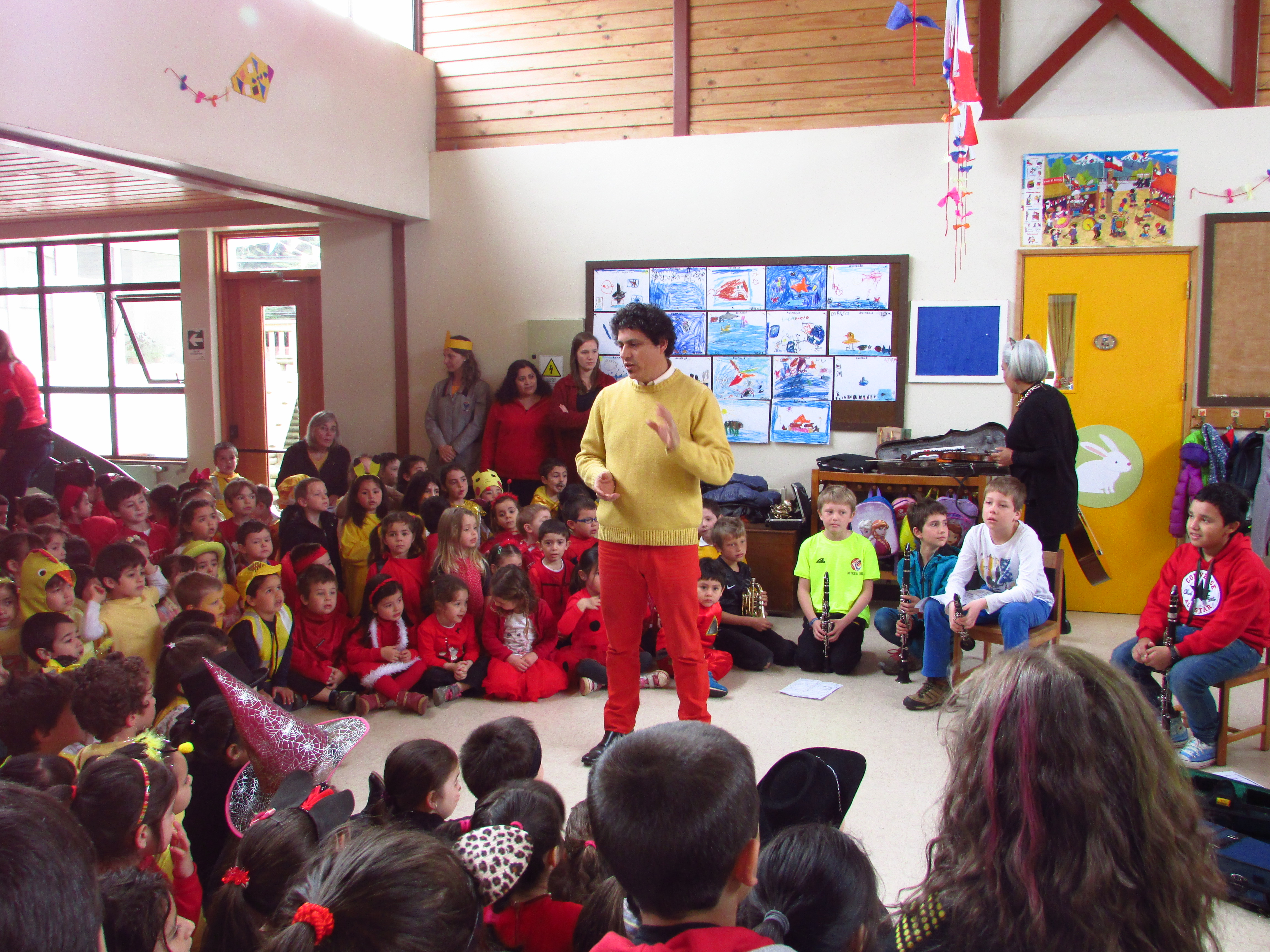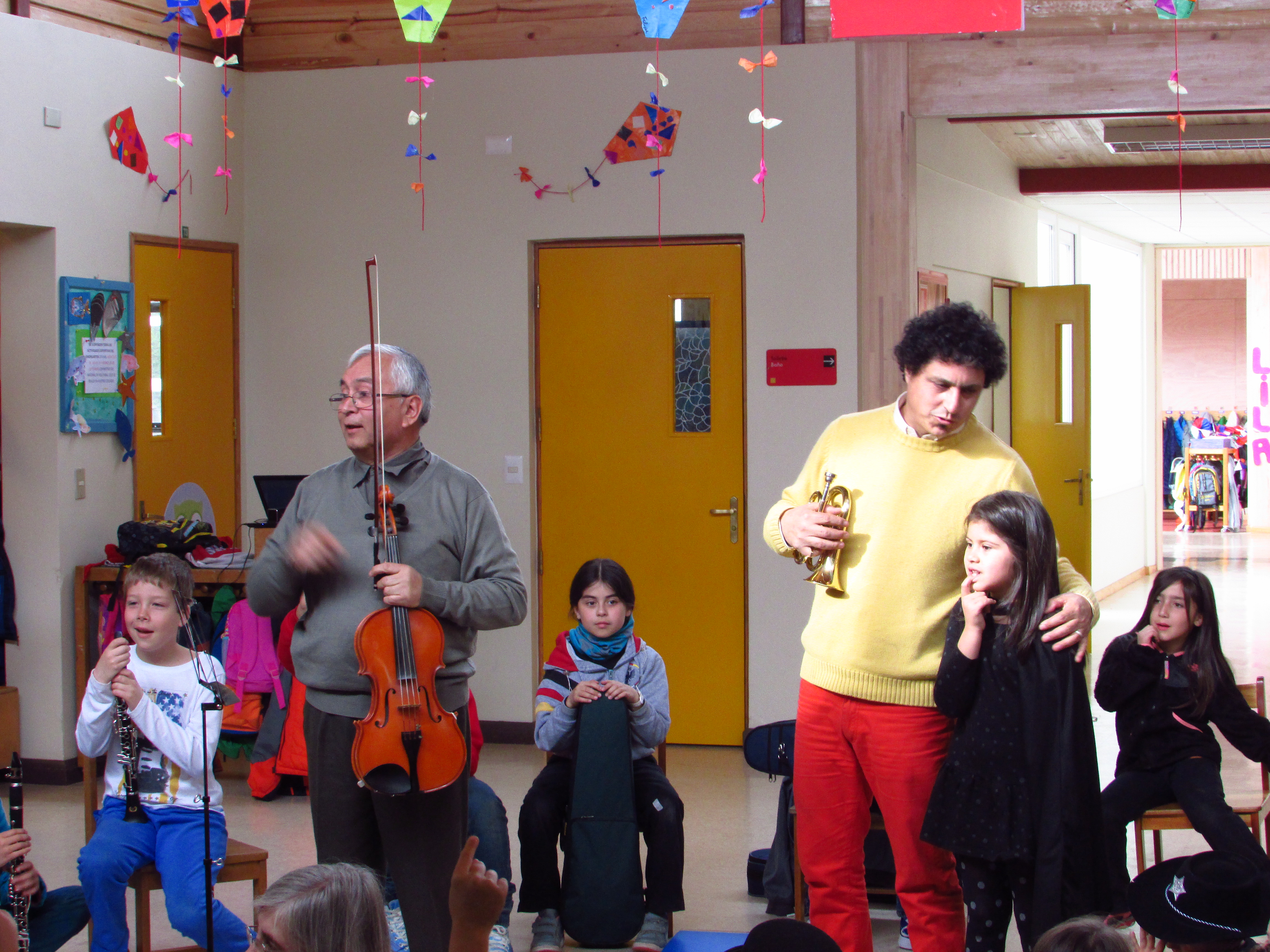 Los monitores de instrumentos Jorge Valdebenito, (flauta traversa, clarinete y trompeta) y Jorge Marchant (violín y viola), junto a la profesora Teresa Benavides y a alumnos instrumentistas, mostraron ayer a los estudiantes de Kindergarten los distintos instrumentos que pueden aprender en nuestro colegio.