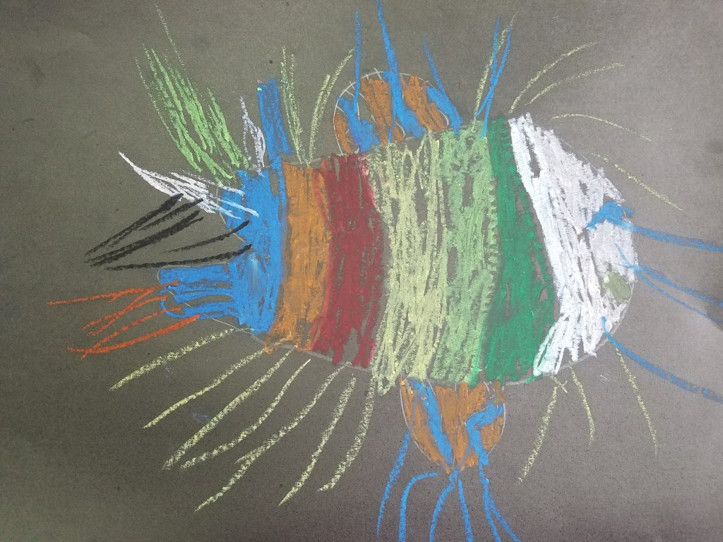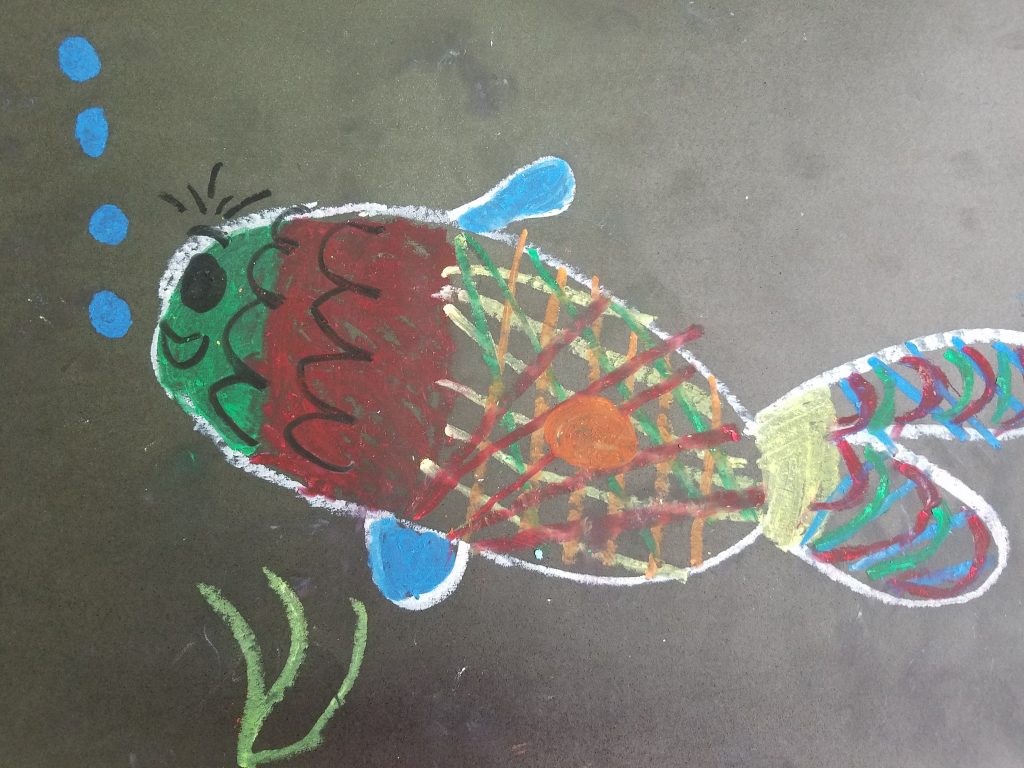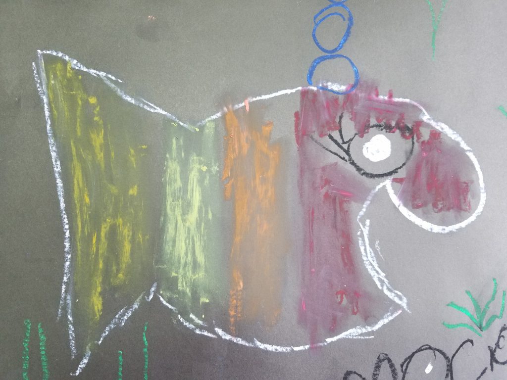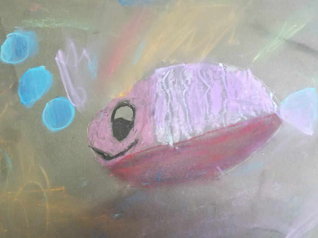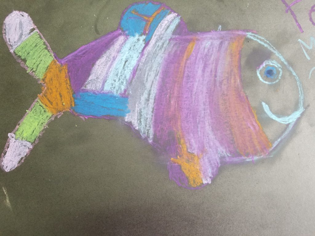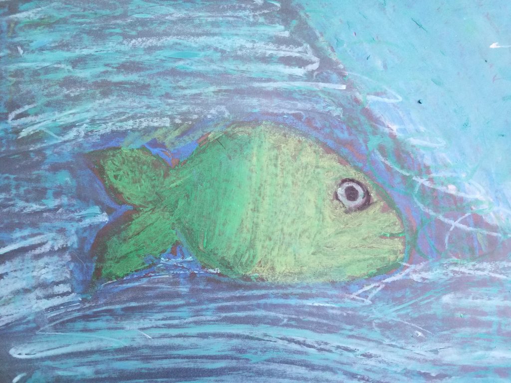 El libro de Mies van Hout muestra una serie de dibujos de peces con distintas expresiones para mostrar cómo se manifiesta en el semblante cada una de ellas. Las palabras que definen las emociones están escritas al lado. Los alumnos trabajaron con ese texto y sus dibujos para identificar emociones y sentimientos como alegría, ira, orgullo, envidia, amor, paz y curiosidad entre otros.