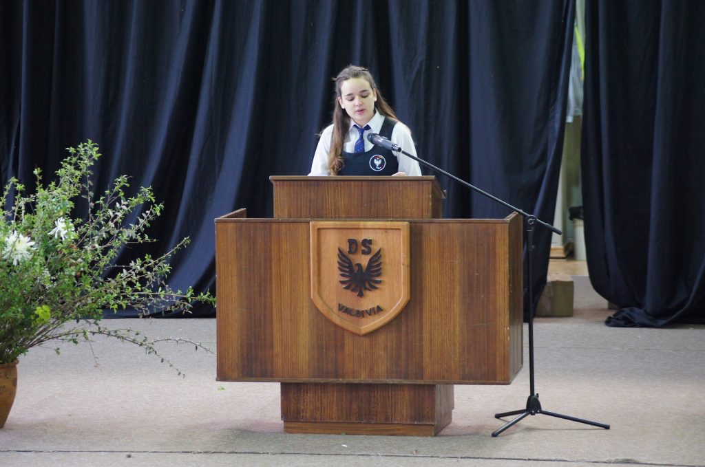 La Presidente del Centro de Alumnos, Ignacia Kunstmann, se dirigió a la Comunidad Escolar en su saludo por el aniversario 159 del colegio y señaló además que este año se realizaron cambios en las festividades, los que fueron presentados más tarde por la directiva.