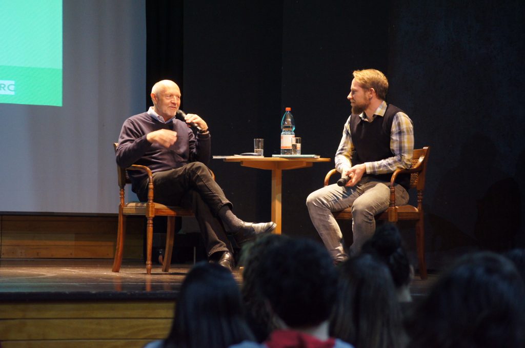 El profesor Ulf Kaschl realizó la introducción al tema con algunas preguntas para contextualizar y dio paso al invitado, quien cuenta con una larga carrera periodística freelance, principalmente como escritor de viajes, lo que le ha dado la base para escribir sus libros, la mayoría de ellos en relación con los lugares que ha conocido.