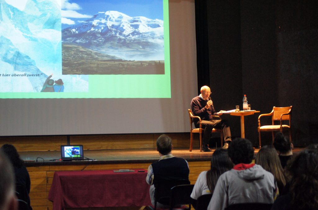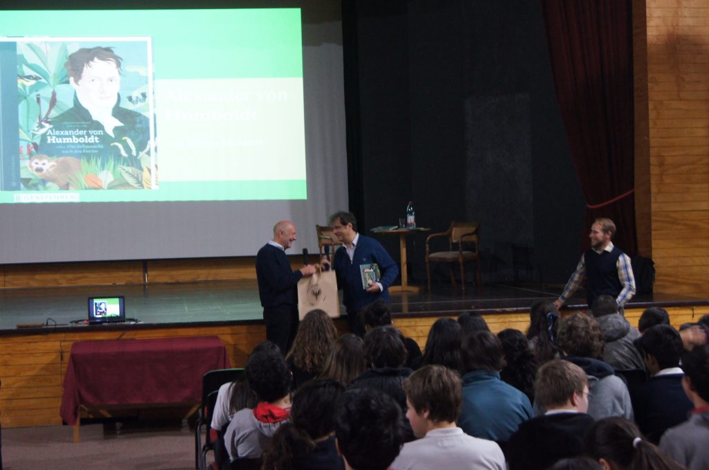 Volker Mehnert comenzó relatando a nuestros alumnos la motivación de von Humboldt para explorar tierras lejanas, lo que dio a su libro el subtítulo de “el anhelo por lo desconocido”; la búsqueda y la exploración de nuevos horizontes, y, más allá de eso, el conocimiento y comprensión de la Naturaleza en todos los ámbitos de la ciencia que los avances tecnológicos de la época permitieron al científico.