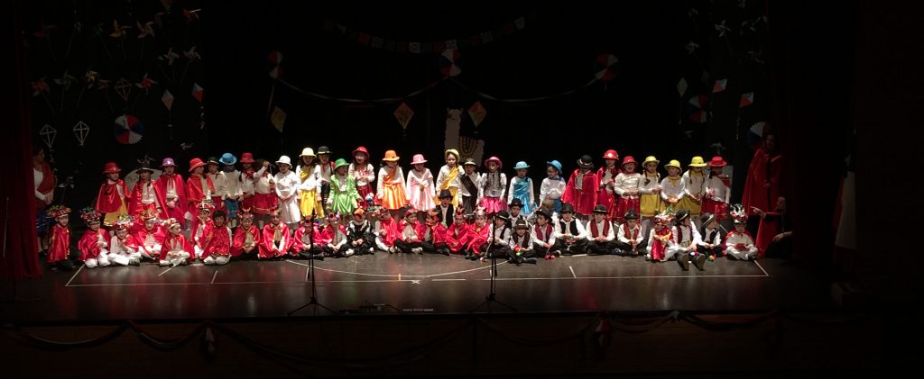Coloridos trajes típicos dieron un alegre realce a la presentación en la que hubo cuadros musicales como “Tejiendo red” y “La Minga”, la “Mazamorra del poroto Coscorrón”, y el “Mambo de Machaguay”, entre todos los que bailaron, cantaron o recitaron los niños.