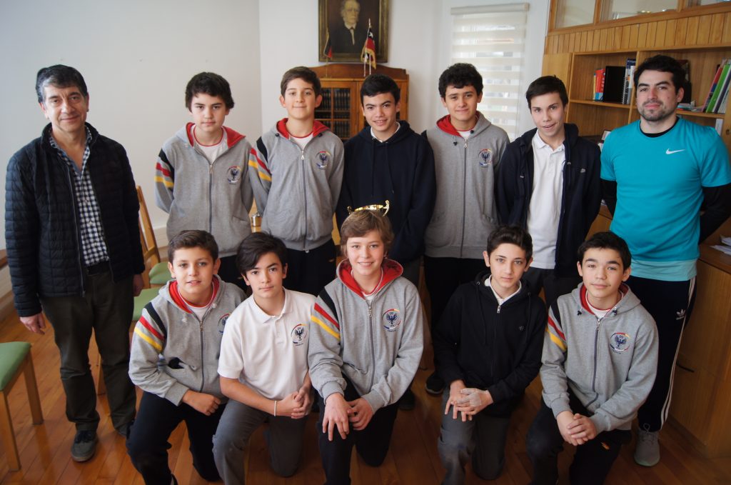 Junto a su entrenador, el profesor Germán Kutchartt, los alumnos sub 14 de Básquetbol hicieron entrega esta mañana al Rector (I) Alfredo Grosolli del trofeo que los acredita como ganadores del Campeonato “Copa San Luis”.