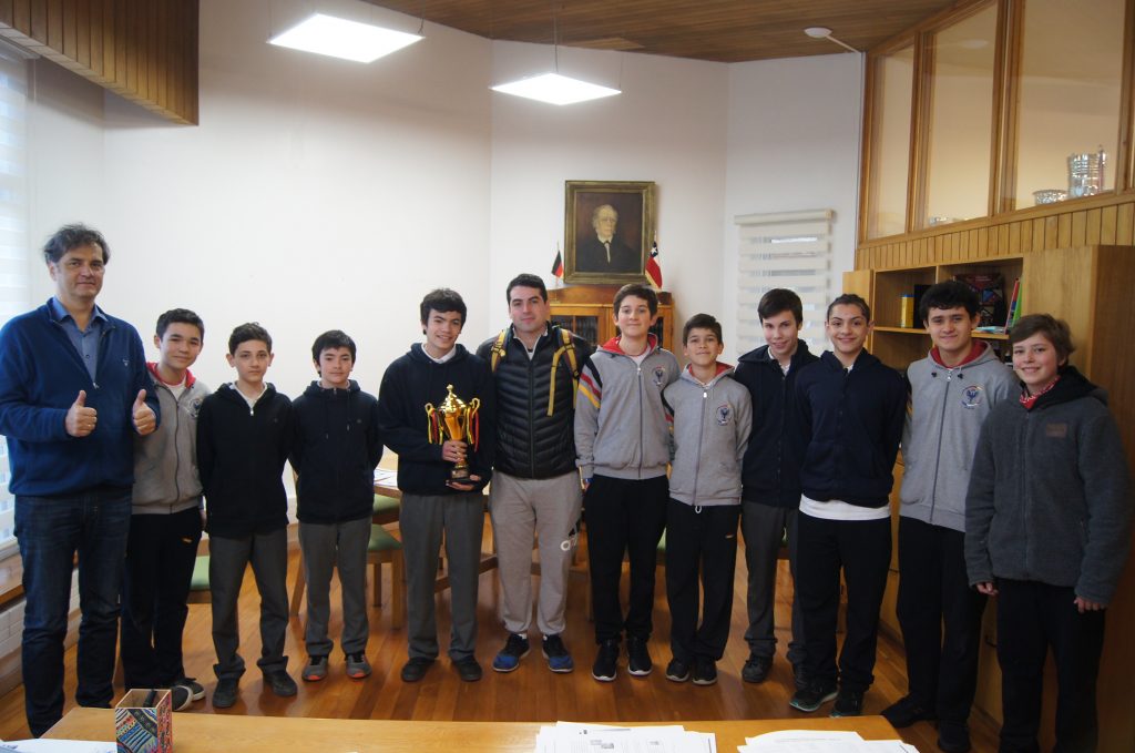 Acompañados por el profesor Germán Kutchartt, su entrenador de Básquetbol, los alumnos de la categoría infantil hicieron entrega de la copa por el 2º lugar en el Campeonato de Básquetbol Infantil de Colegios Alemanes, que se realizó este año en Temuco, organizado por el Colegio Alemán de esa ciudad, desde el miércoles 28 al sábado 31 de agosto.
