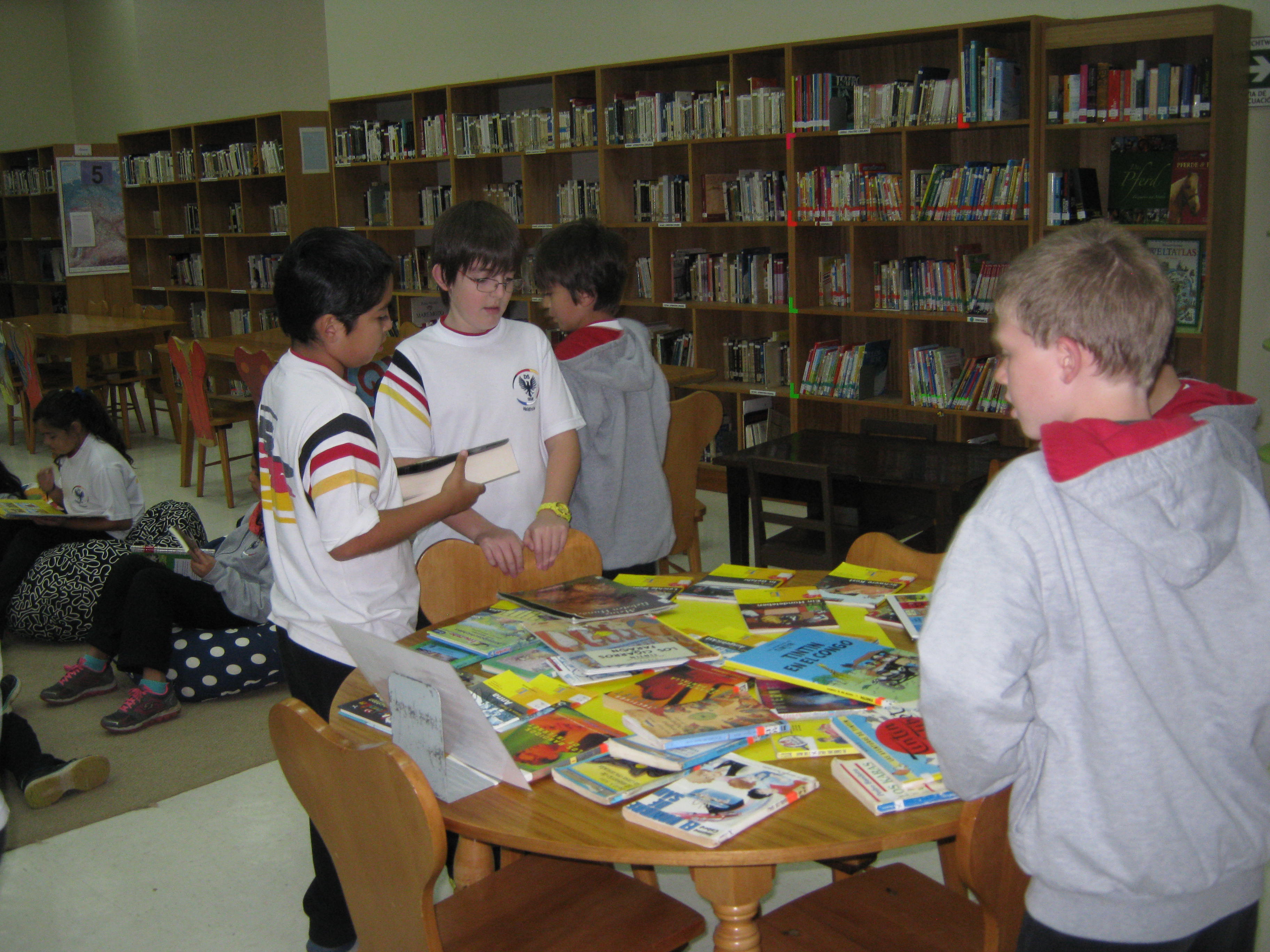 Para apoyar a todos nuestros pequeños lectores y para que conozcan la gran oferta de cuentos e historias de nuestra biblioteca, su encargada, Annette Raths, realizó estaciones con diferentes temas: historias familiares, novelas policiales, ciencia, arte y manualidades, animales y naturaleza, e historia.