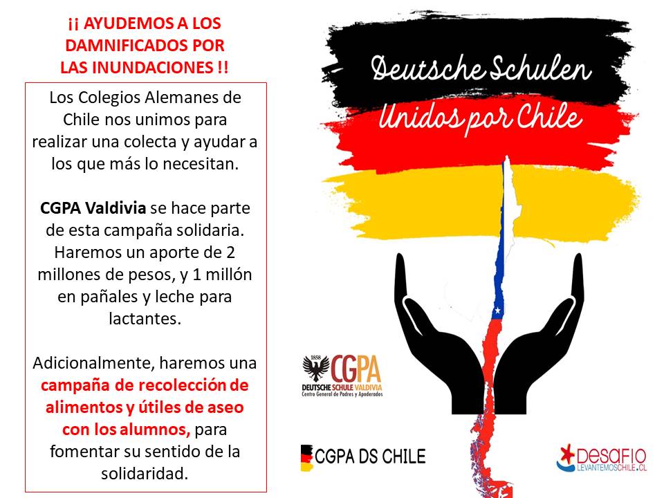 Además, en coordinación con los Centros de Padres de los Colegio Alemanes de Chile se hará un aporte conjunto a “Desafío Levantemos Chile”. El CGPA de nuestro Instituto realizará una donación de dos millones de pesos en nombre de toda la comunidad escolar, un millón en dinero y un millón con pañales y leche para lactantes.