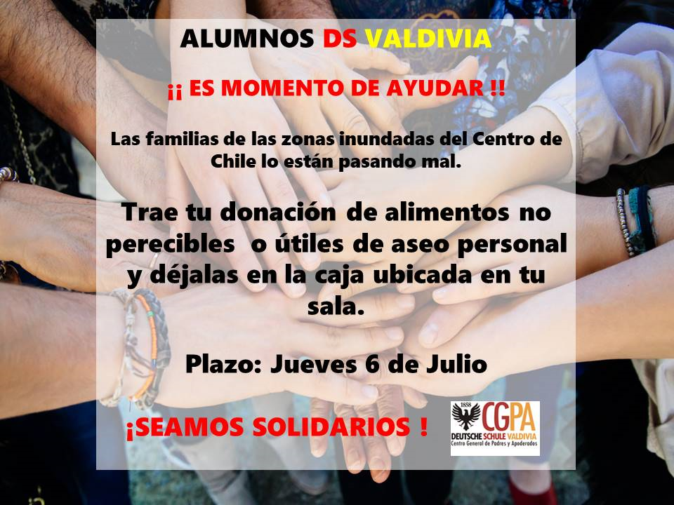 Desde la directiva del Centro General de Padres y Apoderados hacen un llamado a todos los integrantes de nuestra Comunidad Educativa a realizar donaciones que irán en directo apoyo a familias de damnificados por las inundaciones en la zona centro sur del país.