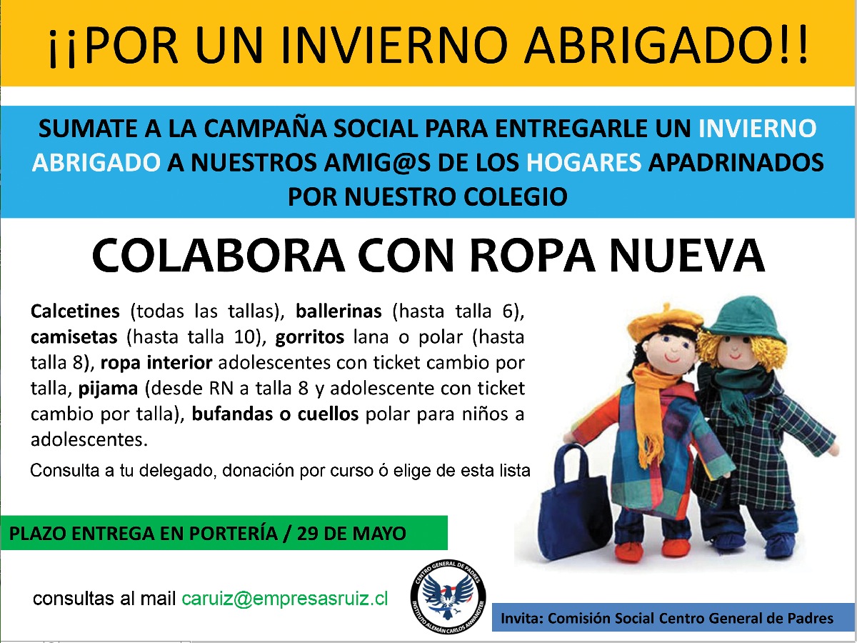 Hasta el 29 de mayo se recibirán las donaciones de ropa nueva que irá destinada a los menores de los hogares con los que nuestro Instituto colabora a través de las actividades y campañas organizadas por la Comisión Social del Centro General de Padres.