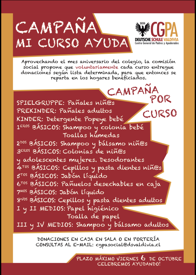Hasta el viernes 06 de octubre hay plazo para traer un aporte voluntario a la campaña en beneficio de los hogares “Belén”, “Villa Huidif”, “Principito de Los Ríos” y “Luterano”, para lo cual hay cajas de recepción en cada sala.