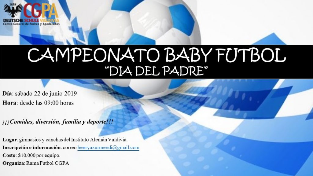A partir de las 09:00 hrs. del sábado 22 de junio se realizará el Campeonato de Baby fútbol “Día del Padre”, en los gimnasios y cancha del colegio.