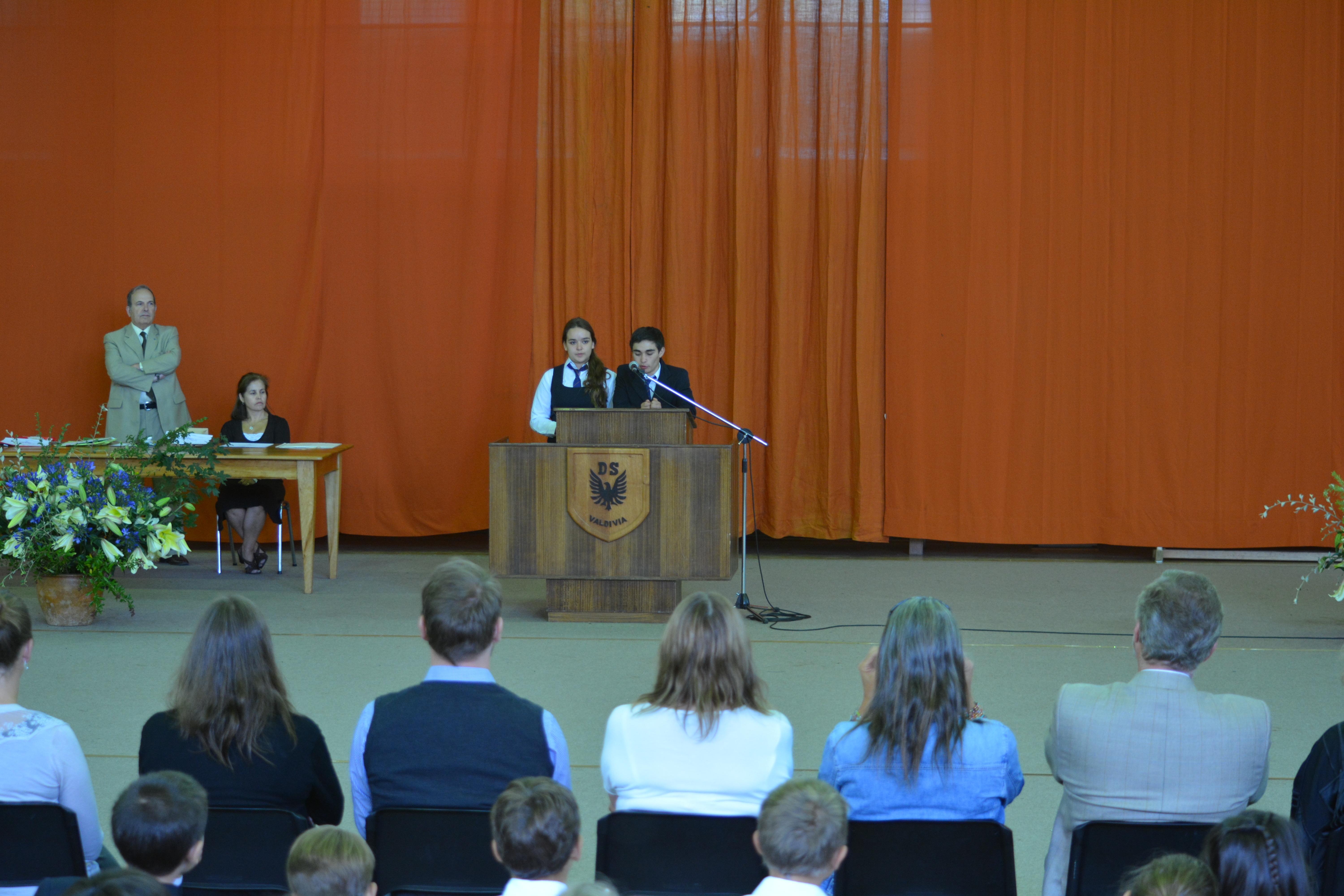 La primera pausa musical estuvo a cargo de la alumna de 3º básico Javiera Arévalo, quien interpretó una Sonatina de Juan Sebastián Bach, tras la cual los representantes del Centro de Alumnos, Ignacio Kunstmann (vicepresidenta) y Nicolás Villarroel (presidente) saludaron a los presentes y en especial a sus compañeros, instándolos a aprovechar y valorar cada momento de la vida escolar para lograr las metas de mayor cohesión y compromiso que el representativo ha elegido. Uno de los logros que destacaron para este año es el regreso de la extraprogramática de Básquetbol femenino, que se suma a la larga lista de actividades ofrecidas por el colegio.