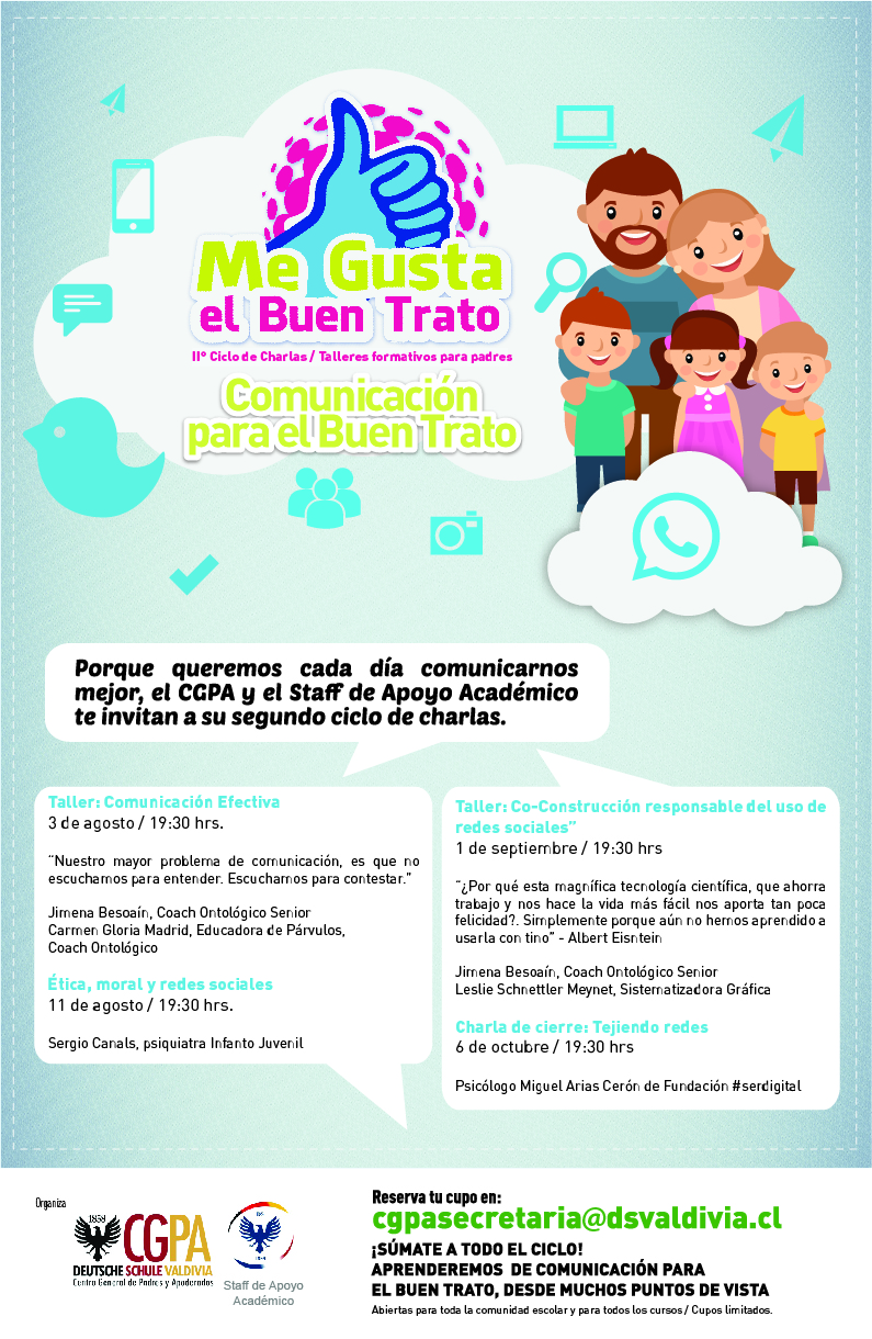 En conjunto con el Staff de Apoyo Académico de nuestro Instituto, el Centro General de Padres y Apoderados invita a padres, docentes y adultos de nuestra Comunidad Escolar a asistir y participar en este ciclo, que considera dos charlas y dos talleres bajo el lema de comunicación para el buen trato.
