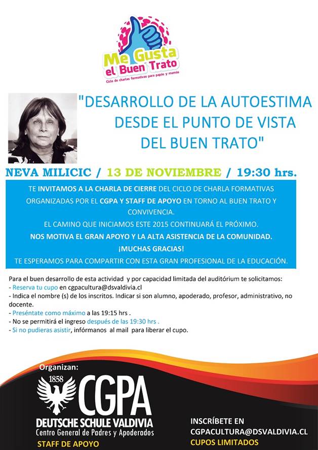 03.11.2015 La especialista se encontrará en nuestro Instituto el viernes 13 a las 19:30 hrs., con el tema “Desarrollo de la autoestima desde el punto de vista del buen trato”. La asistencia es por inscripción.