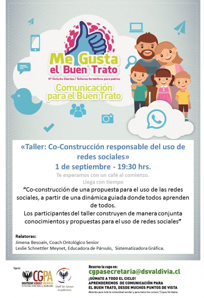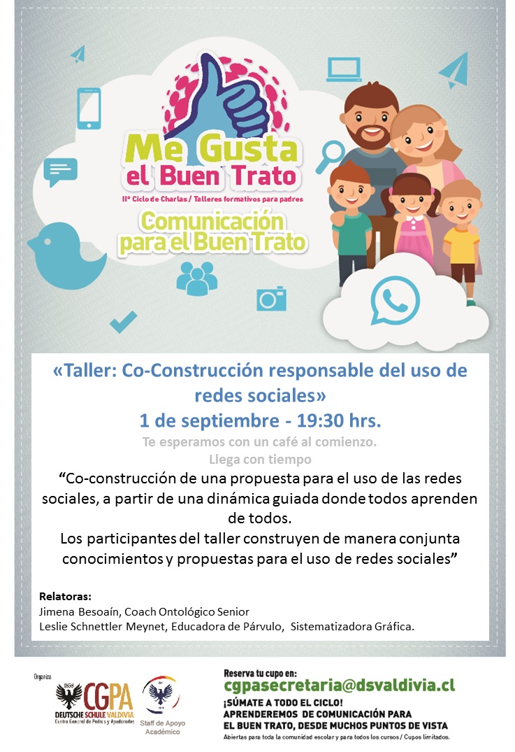 En el marco del ciclo de charlas de comunicación para el buen trato, el Centro General de Padres y Apoderados de nuestro Instituto invita a toda la Comunidad Escolar, especialmente a papás y mamás, a participar en el taller que será dictado por las profesionales Jimena Besoaín, Coach Ontológico Senior, y Leslie Schnetler, Educadora de Párvulos y Sistematizadora Gráfica.
