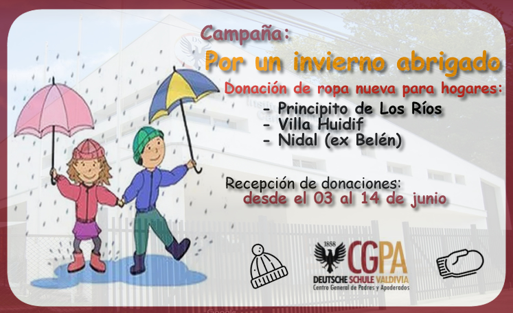 Entre el lunes 03 y el viernes 14 de junio se recolectarán las donaciones de prendas nuevas para abrigo, las que irán a beneficio de los hogares de menores con los que colabora el Centro General de Padres y Apoderados, a través de su Comisión Social: Principito de Los Ríos, Villa Huidif y Nidal (ex Hogar Belén).