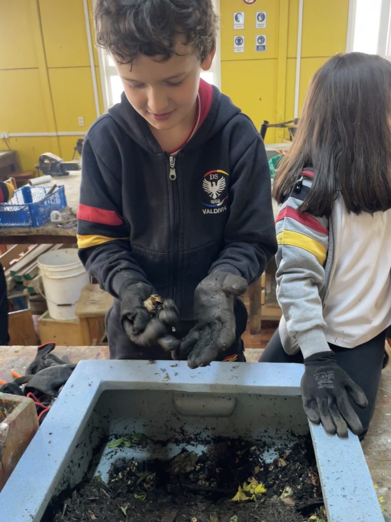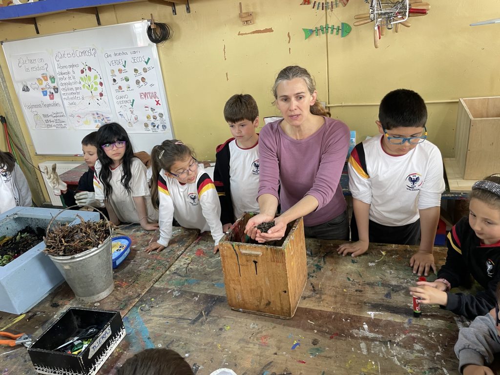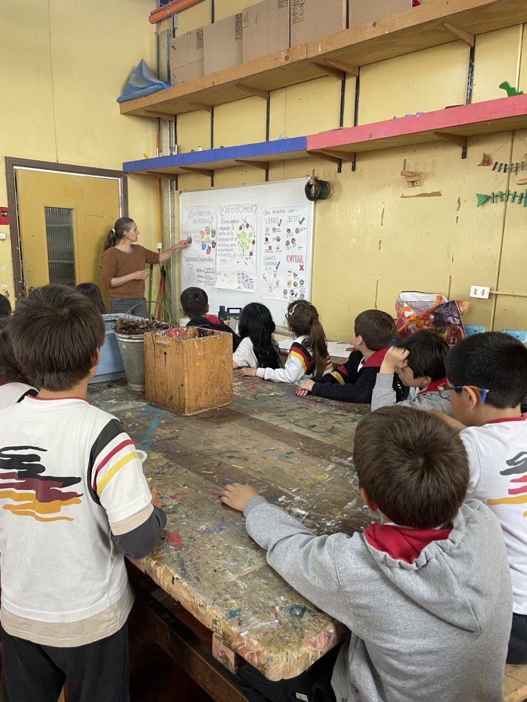 La Comisión de Medioambiente del Centro General de Padres y Apoderados y el Taller de Invernadero, que dirige la profesora Paula Rodríguez, organizaron en conjunto una charla sobre compostaje a cargo de la apoderada Camila Becker, quien el jueves por la tarde enseñó a los estudiantes cómo elaborar compost utilizando residuos orgánicos.