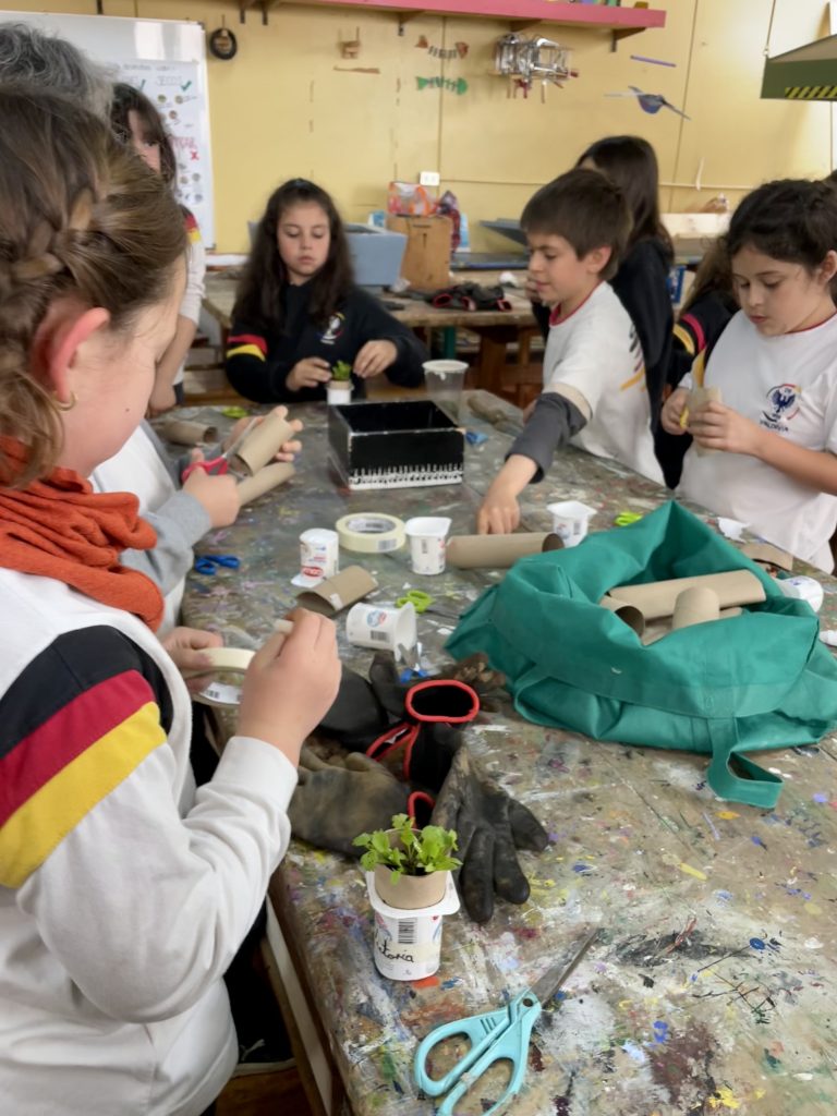 Tras la exposición, los alumnos construyeron camas de compost, prepararon macetas reutilizadas y llevaron a sus hogares plantines de cilantro para continuar el aprendizaje con el cuidado de los retoños en casa.
