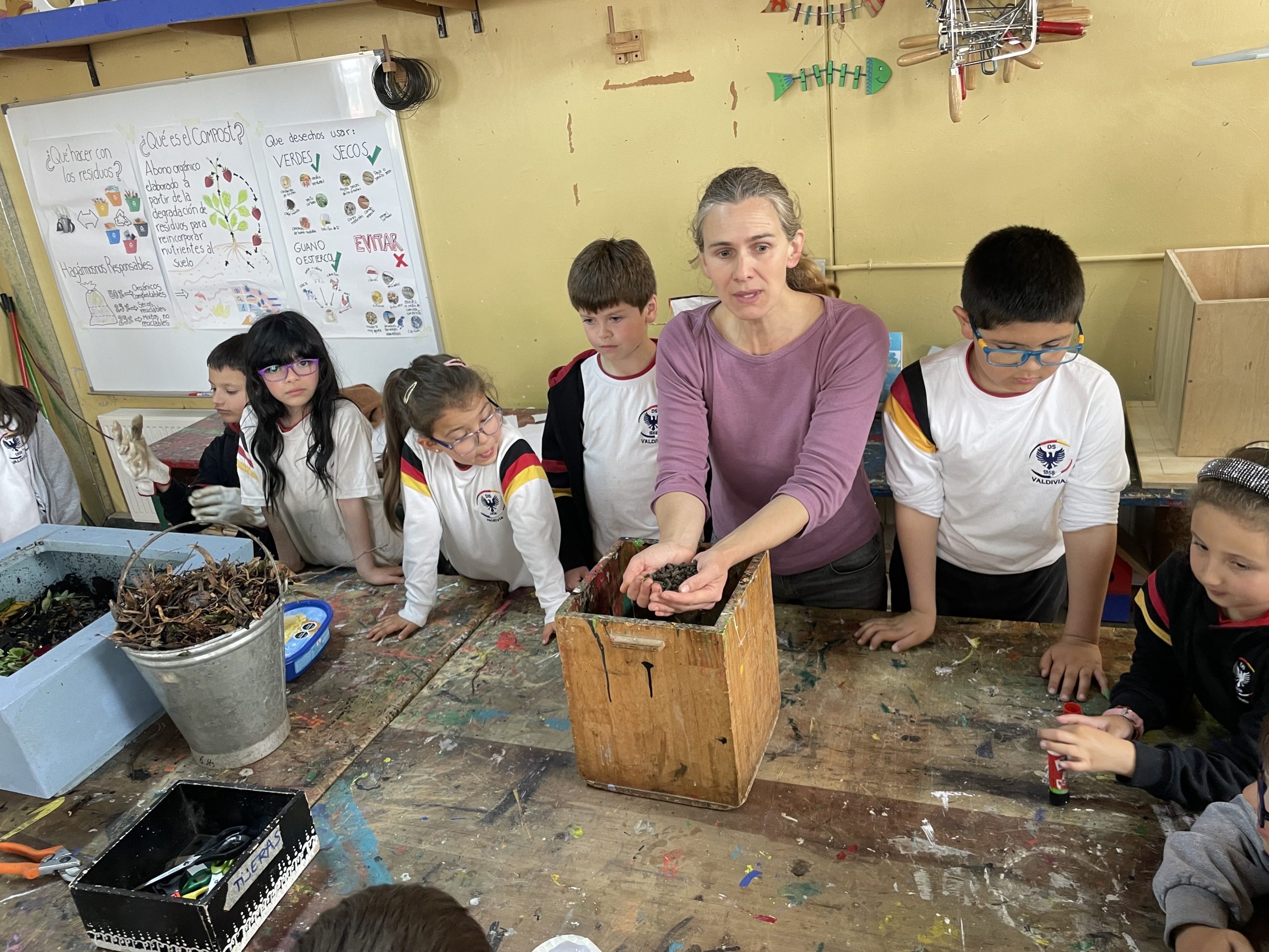 La Comisión de Medioambiente del Centro General de Padres y Apoderados y el Taller de Invernadero, que dirige la profesora Paula Rodríguez, organizaron en conjunto una charla sobre compostaje a cargo de la apoderada Camila Becker, quien el jueves por la tarde enseñó a los estudiantes cómo elaborar compost utilizando residuos orgánicos.