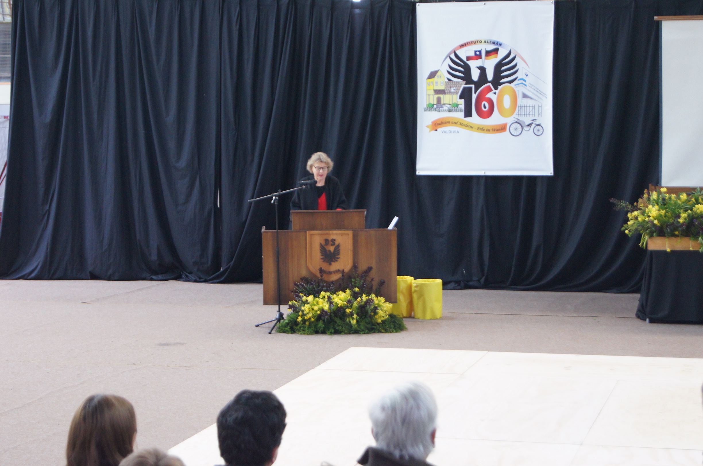 El inicio se dio con la interpretación de los himnos de Chile y Alemania, a cargo de la Orquesta Juvenil del Instituto, y coreados por todos los presentes, dirigidos por el profesor Jaime Pino. A continuación, los pequeños de Kindergarten hicieron un regalo a sus compañeros mayores con una colorida coreografía de “Todos juntos” de Los Jaibas, apuntando a la unidad de los pueblos. Nuestra Rectora, Liske Salden, en sus breves palabras enfatizó la biculturalidad de nuestro Instituto, el acento en el alemán, no sólo como idioma, sino como transmisor de una cultura diferente que se ha unido a la chilena para hacer de nuestro Instituto el colegio que actualmente es.