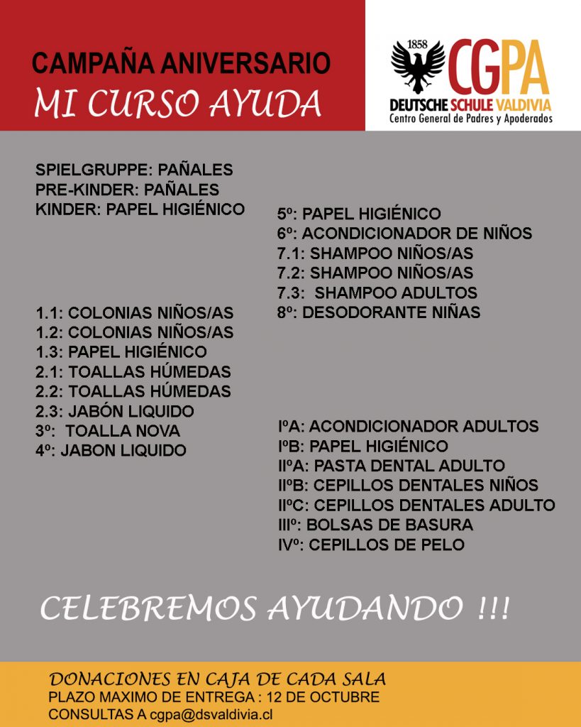 “Mi curso ayuda” es la campaña social en beneficio de los hogares apoyados por el Centro General de Padres y Apoderados, y a través de esta instancia por toda nuestra Comunidad Educativa, que se llevará a cabo durante el mes aniversario de nuestro Instituto; celebraremos ayudando.
