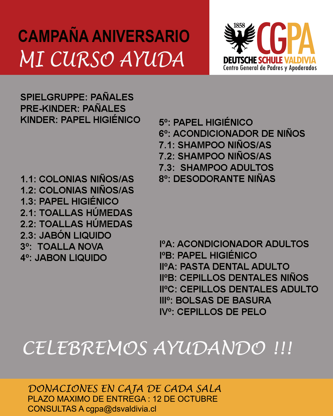 “Mi curso ayuda” es la campaña social en beneficio de los hogares apoyados por el Centro General de Padres y Apoderados, y a través de esta instancia por toda nuestra Comunidad Educativa, que se llevará a cabo durante el mes aniversario de nuestro Instituto; celebraremos ayudando.