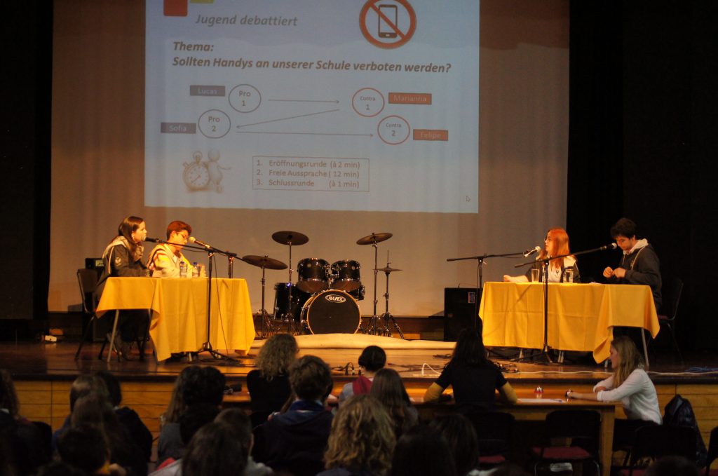 A las 12:30 comenzó ayer la competencia interna entre los alumnos Marianne Busse, III A, Lucas González, II C, Sofía Barrera, III A, y Felipe Davis, III C, quienes debatieron acerca del tema “¿Se deben prohibir los celulares en el colegio?” Lucas y Sofía apoyaban la idea, mientras Marianna y Felipe argumentaban en contra.