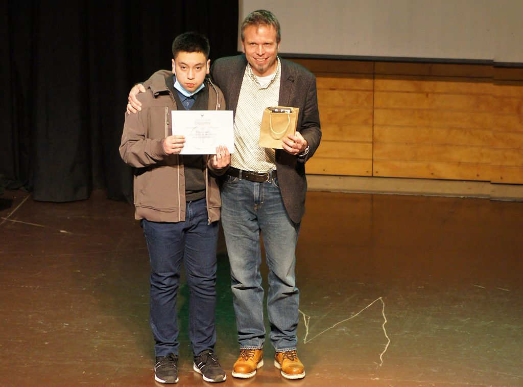 Israel Paredes Villalobos, de la Escuela “Fernando Santiván” fue el creador de la obra “La reconciliación”, ganadora del primer lugar en la categoría de 7º y 8º básico, y a quien premió nuestro Rector Markus Biber. El novel autor se llevó un fuerte aplauso del público; los talleres de Teatro ya se encuentran preparando su obra para ser representada a finales de noviembre, premio al primer lugar.