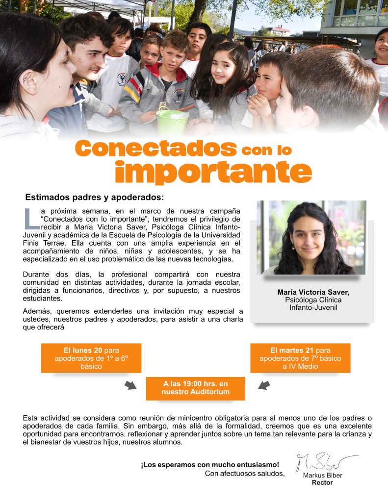 El lunes 20 de 1º a 6º básico y el martes 21 de 7º básico a IV medio, están citados a la exposición de la Psicóloga infanto-juvenil María Victoria Saver.