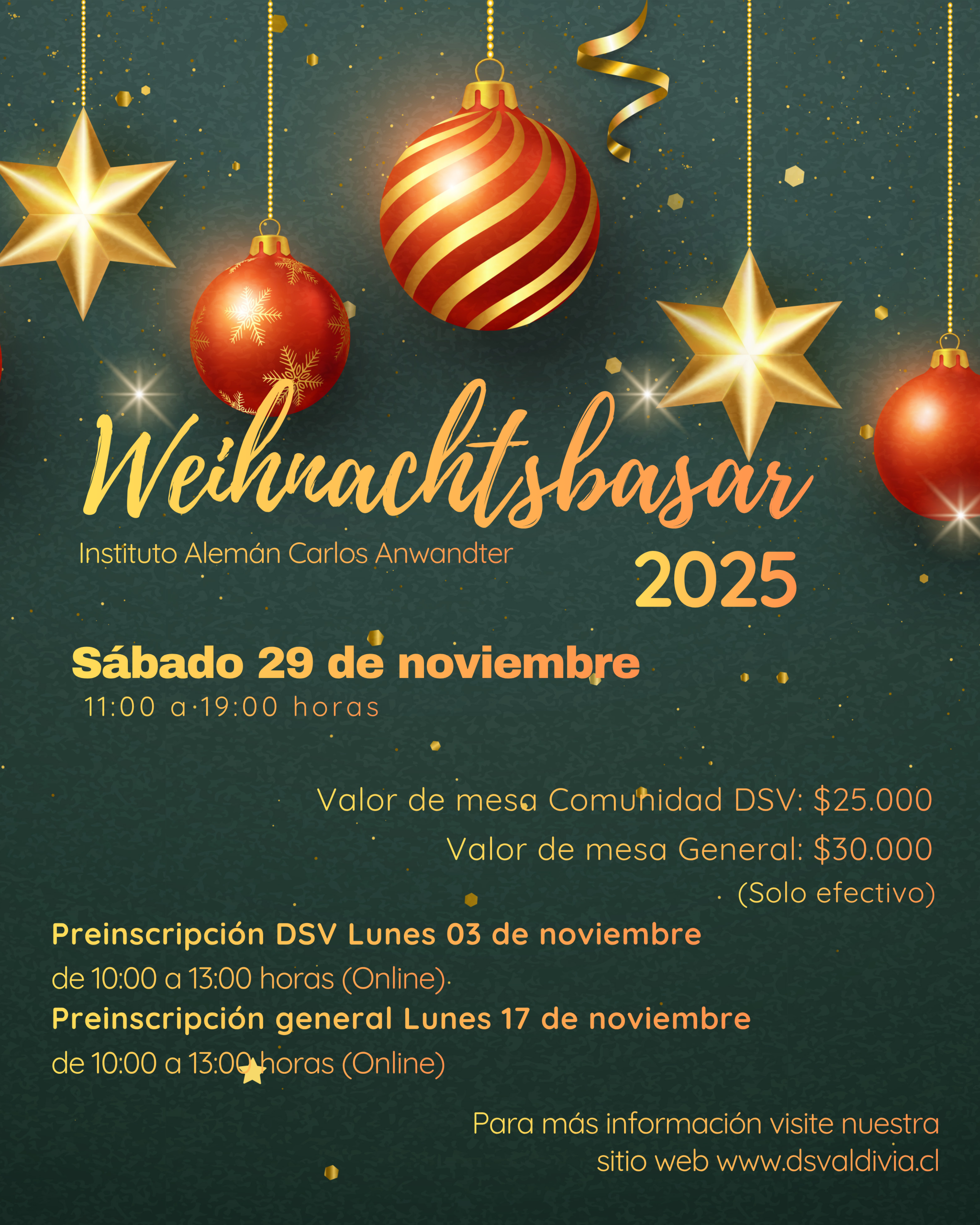 27.10.2025 El tradicional Weihnachtsbasar se realizará el sábado 29 de noviembre, de 11:00 a 19:00 horas, abierto a todo público con entrada liberada.