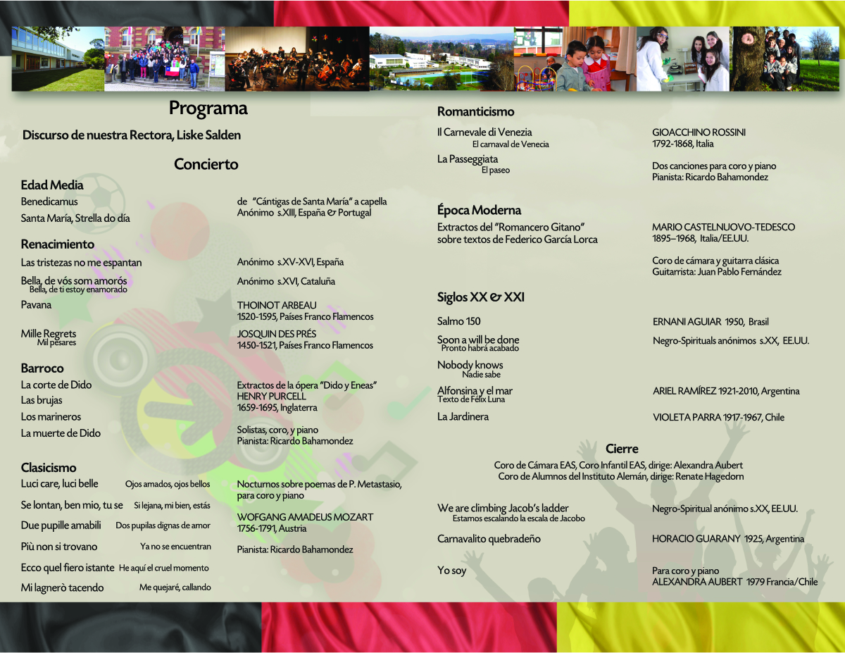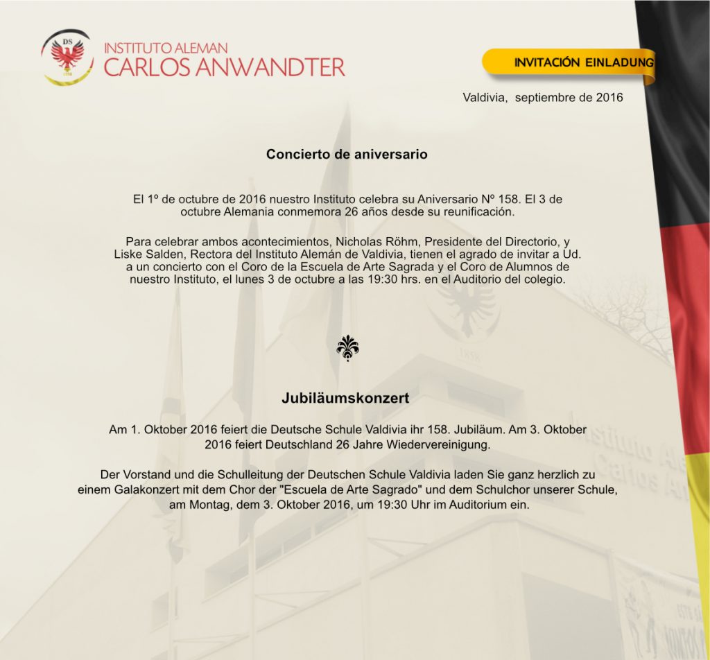 Nuestra Rectora, Liske Salden, y el Presidente del Directorio, Nicholas Röhm, invitan a funcionarios, padres y apoderados, alumnos, exalumnos y amigos de nuestro colegio, a celebrar el Aniversario 158 y los 26 años de la Reunificación Alemana en este concierto de gala, en el que participará el Coro de la Escuela de Arte Sagrado, dirigido por la artista franco-chilena Alexandra Aubert, y el Coro de Alumnos de nuestro Instituto, dirigido por la profesora Renate Hagedorn.