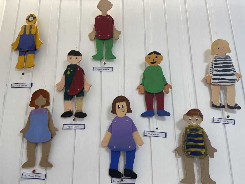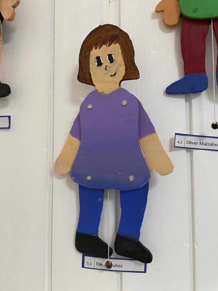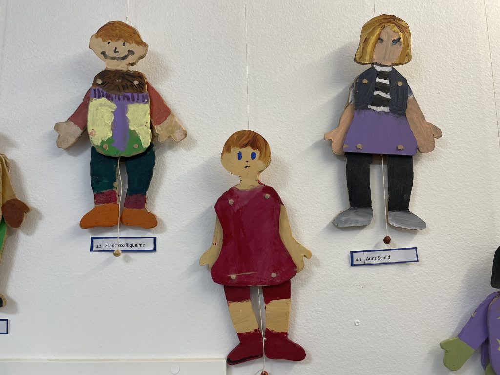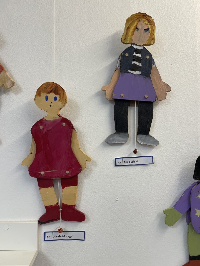 Los Hampelmänner —figuras articuladas que se animan al tirar de sus hilos, levantando brazos y piernas— fueron confeccionados en madera aglomerada utilizando sierra de calar y lija, y posteriormente decorados con dedicación y creatividad por sus jóvenes autores.