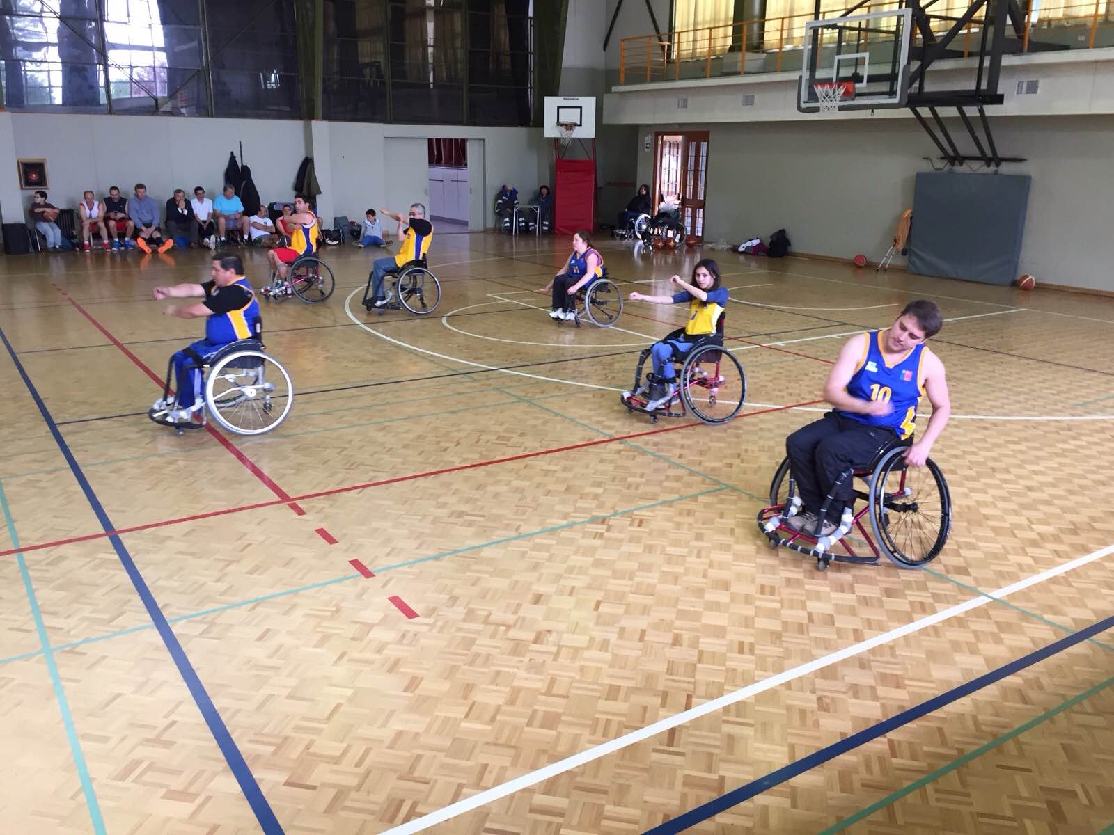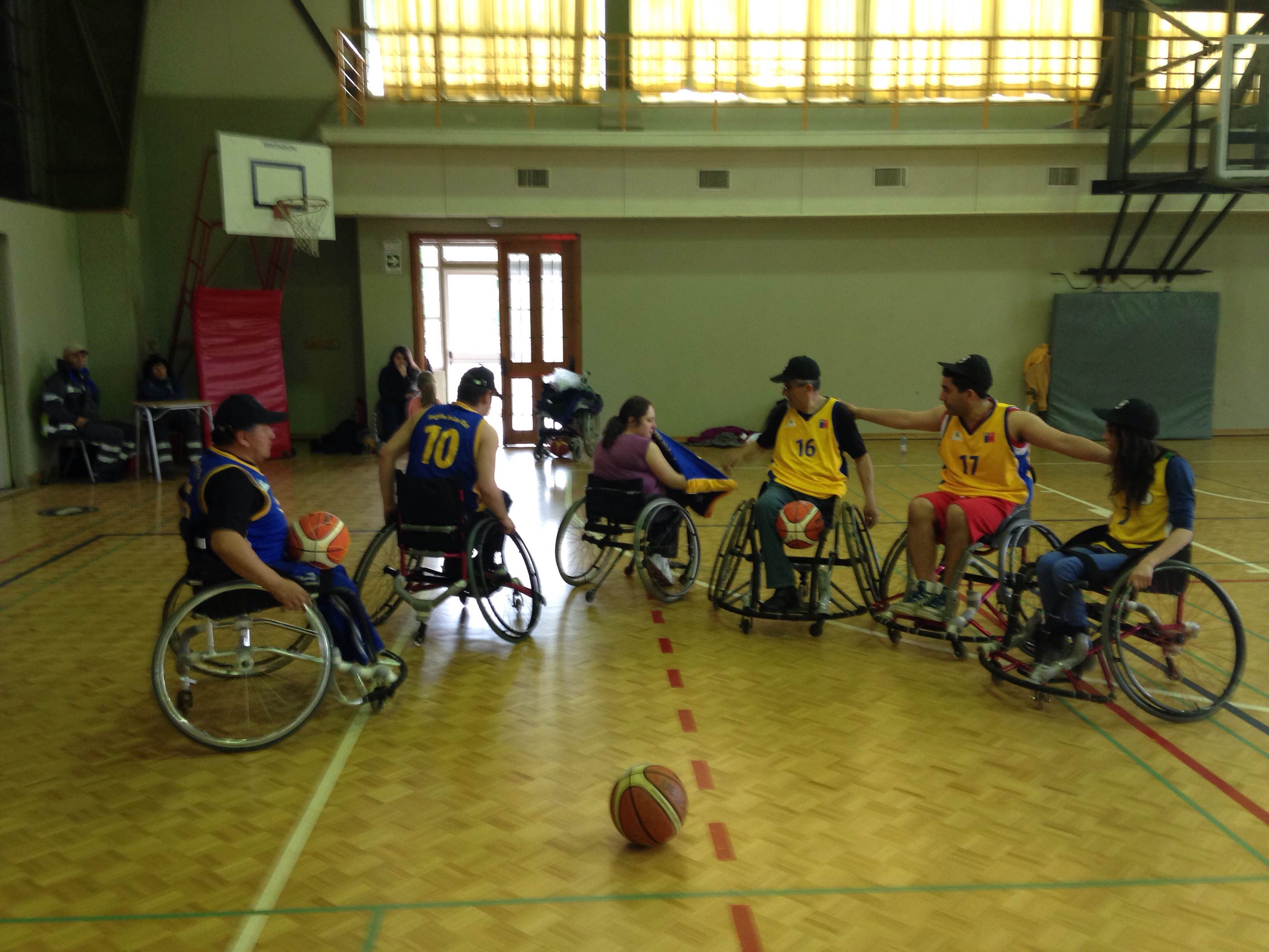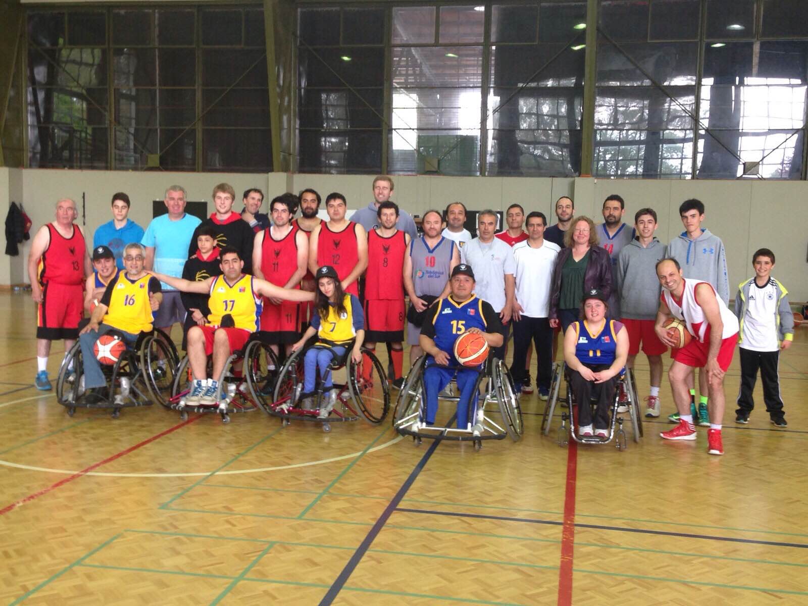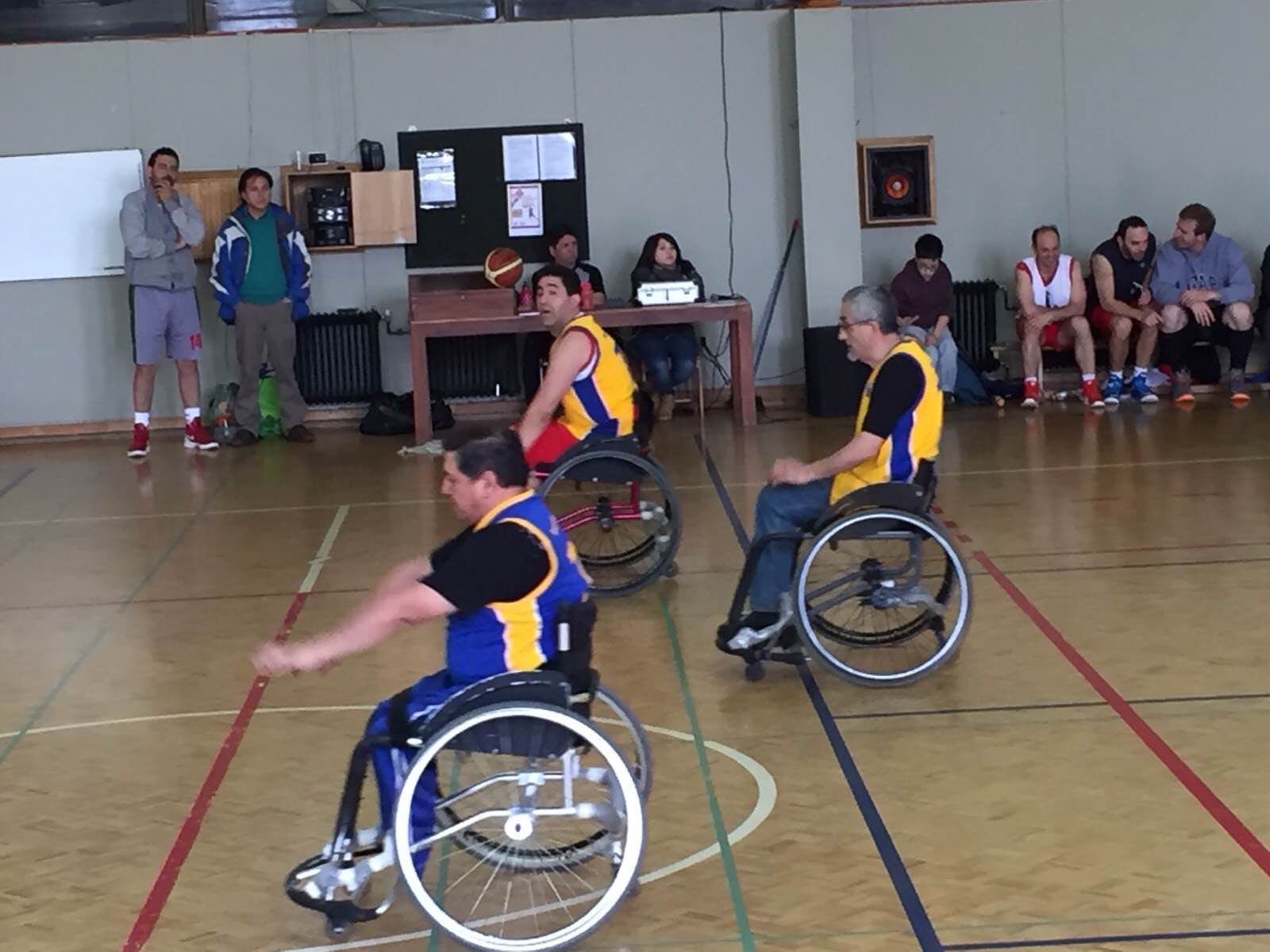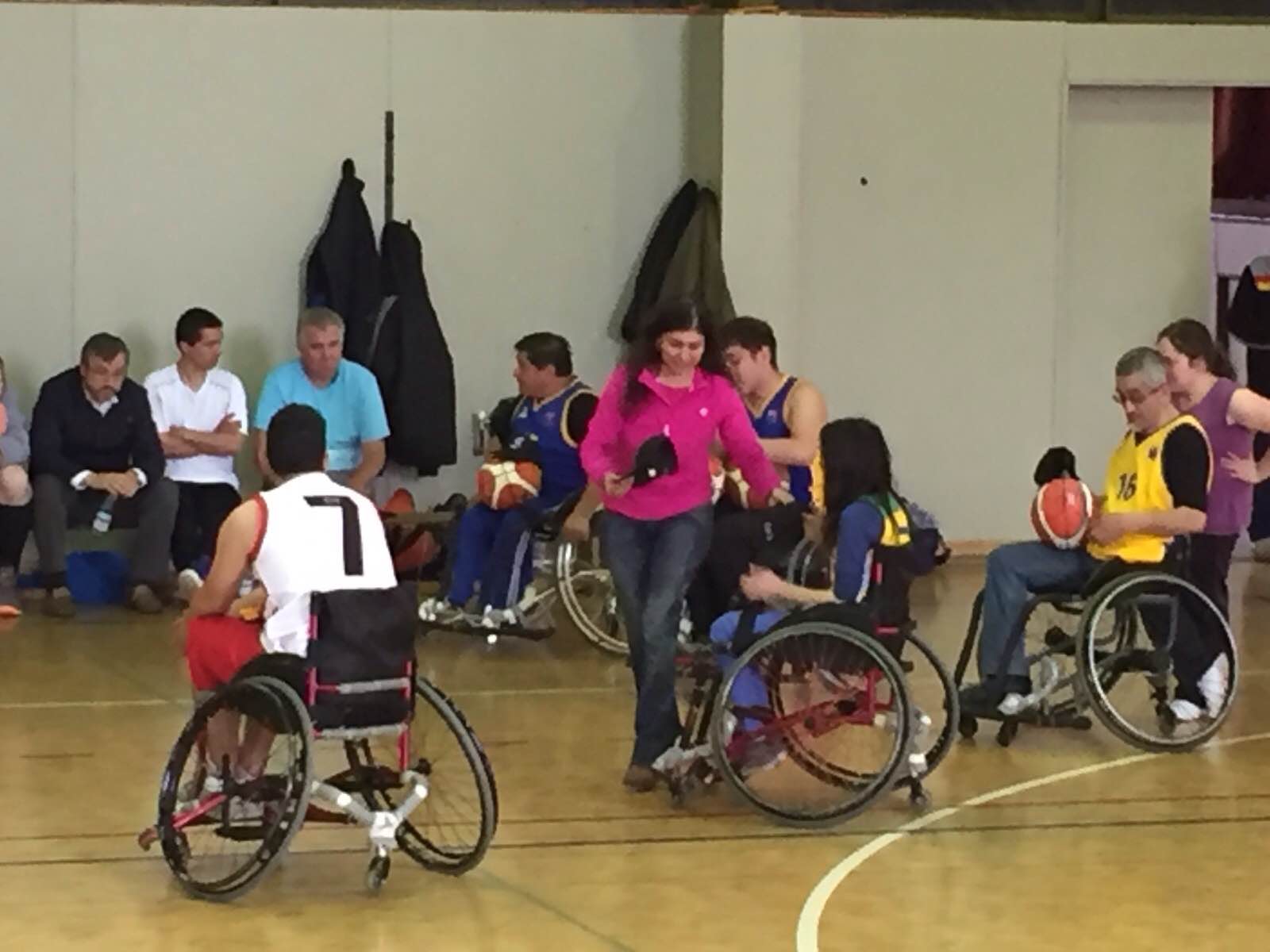 A continuación de realizó la exhibición de básquetbol en sillas de ruedas del Club Adaptado Valdivia, en la que participaron seis integrantes de la institución, quienes demostraron un entrenamiento tipo que consiste en desplazamientos con la silla, cambio de dirección, enfrentamientos en movimiento, ejercicios todos sin balón, para dar paso luego a bandejas y circuitos de pases. Para finalizar su exhibición, los deportistas jugaron un tres contra tres a lo largo de la cancha, muestra muy aplaudida por los presentes, a los que se invitó a vivenciar la experiencia. La Rama de Básquetbol, en agradecimiento por su participación en el evento del sábado, les obsequió balones, y de parte de Silke Heckele, integrante del Consejo Directivo, recibieron el saludo oficial de nuestro Instituto.