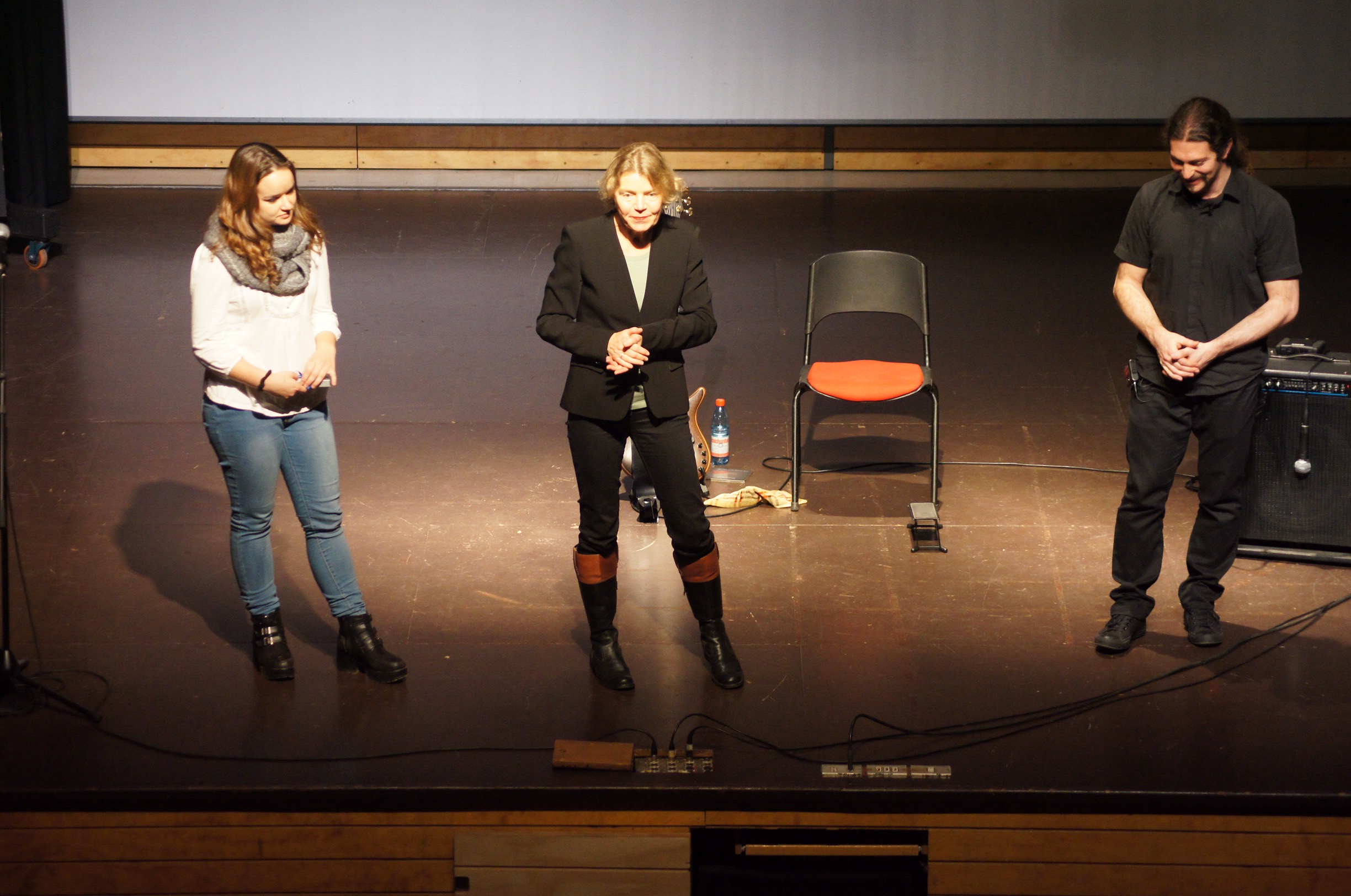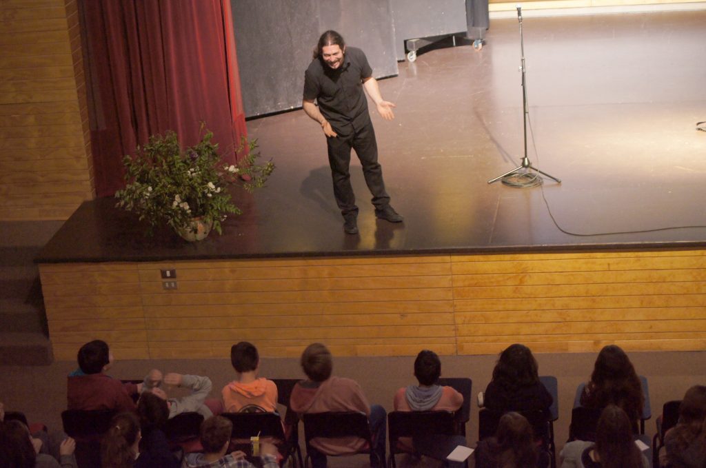 Abschließend überreichte ihm Ignacia Kunstmann im Namen der Schülervertretung ein Präsent. Unsere Schulleiterin Liske Salden dankte dem Künstler für seinen Auftritt und beglückwünschte ihn zu seinem innovativen Stil.