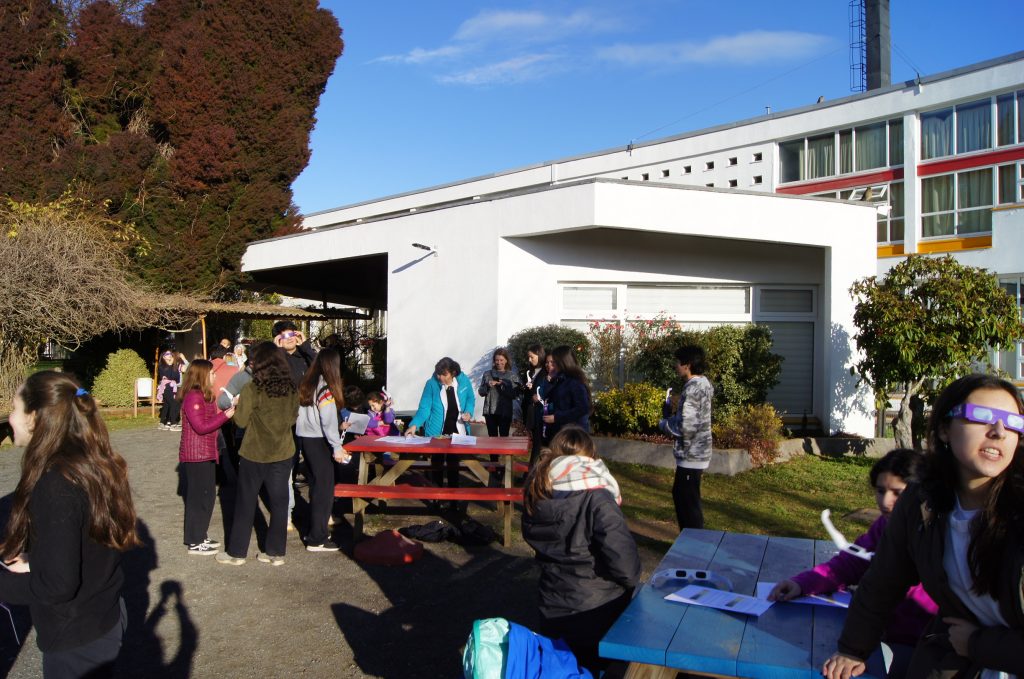 La profesora Alejandra Solsona, Jefe del Departamento de Ciencias del Instituto, dio una breve explicación acerca del fenómeno natural que estaba a punto de comenzar y entregó a los alumnos congregados en el patio frente a la Rectoría una guía con la materia, antes de entregarles los lentes y placas para observar el eclipse.