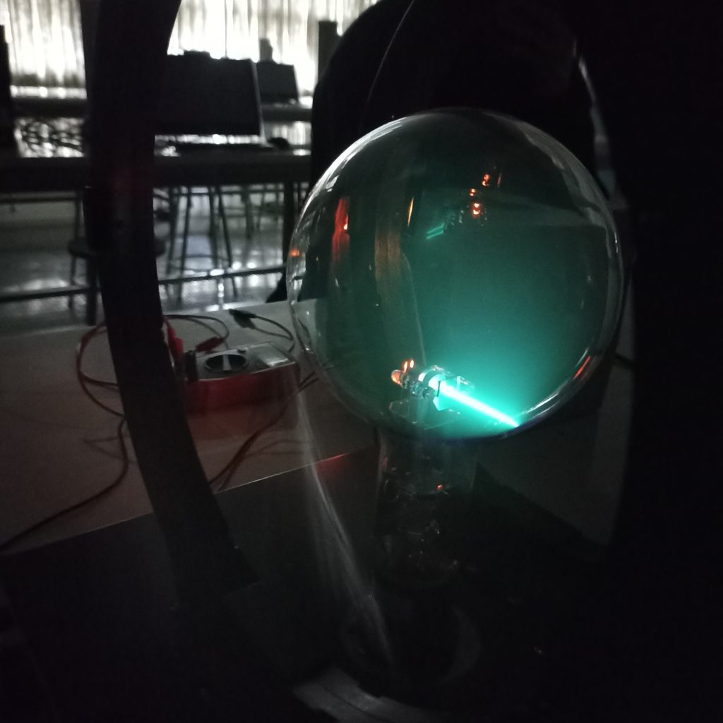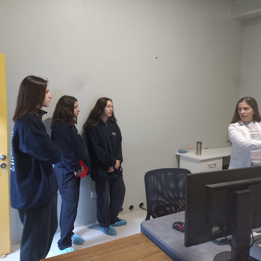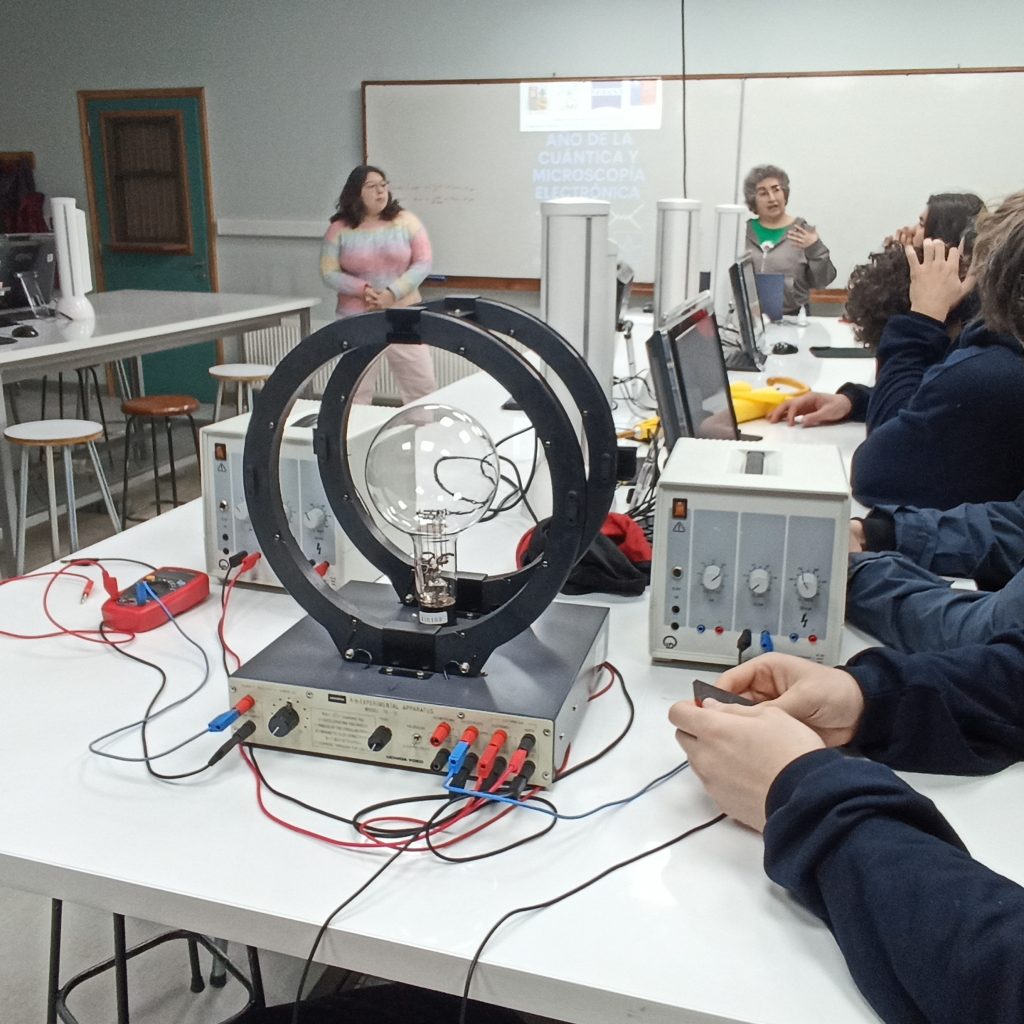 La jornada comenzó con una charla en los laboratorios docentes de Física, titulada Año de la mecánica cuántica y microscopía electrónica, dictada por la doctora en física experimental Judit Lisoni. En esta instancia, los estudiantes pudieron observar demostraciones de espectros discretos y emisión de fotones mediante lámparas con diferentes gases, así como la desviación de un haz de electrones en presencia de un campo magnético, principio fundamental para el funcionamiento de la microscopía electrónica.