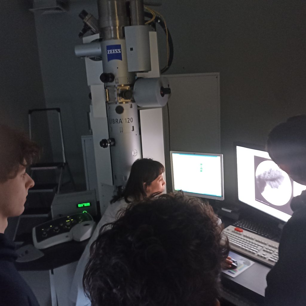 Posteriormente, el grupo se trasladó a la Unidad de Microscopía Electrónica (UME), donde pudieron observar en funcionamiento equipos de alta complejidad como el microscopio electrónico de transmisión (TEM Libra) y los microscopios de barrido (FESEM Auriga y PVSEM Evo). Además, conocieron distintos tipos de muestras y análisis realizados con esta tecnología de vanguardia.