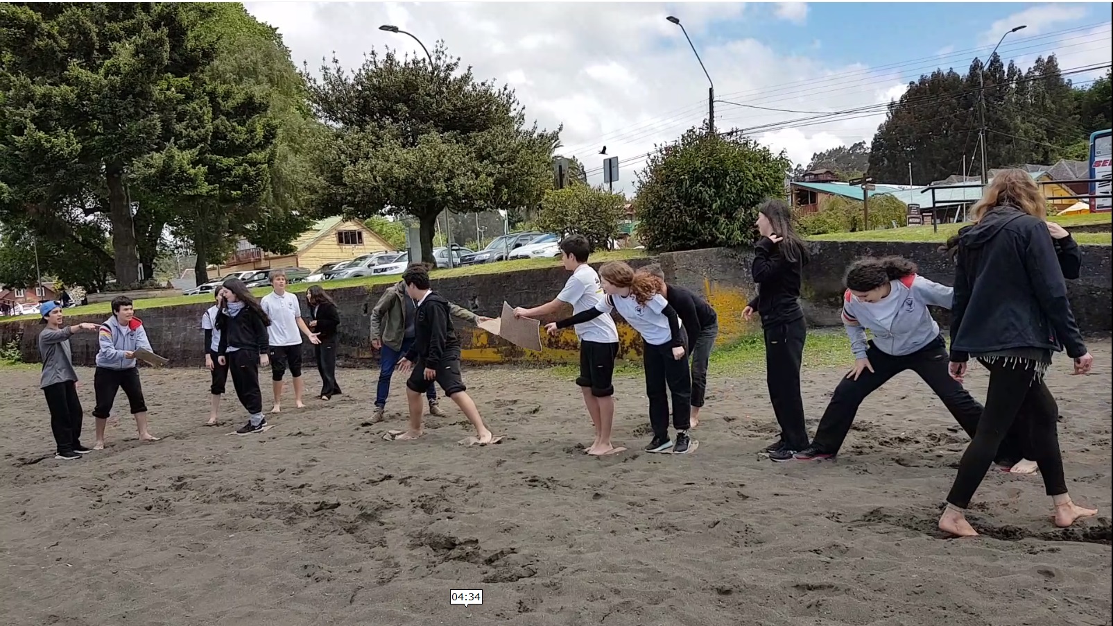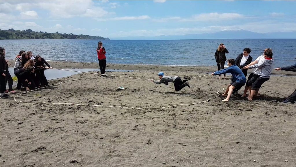 La siguiente actividad dentro de la jornada requirió de un gran trabajo en equipo, ya que la prueba consistió en cruzar un río imaginario lleno de cocodrilos, sobre temblorosas tablas de madera, para rescatar un objeto desde un lago de lava. La mejor manera de resolver una tarea como equipo se discutió después en clases, usando un análisis del video.