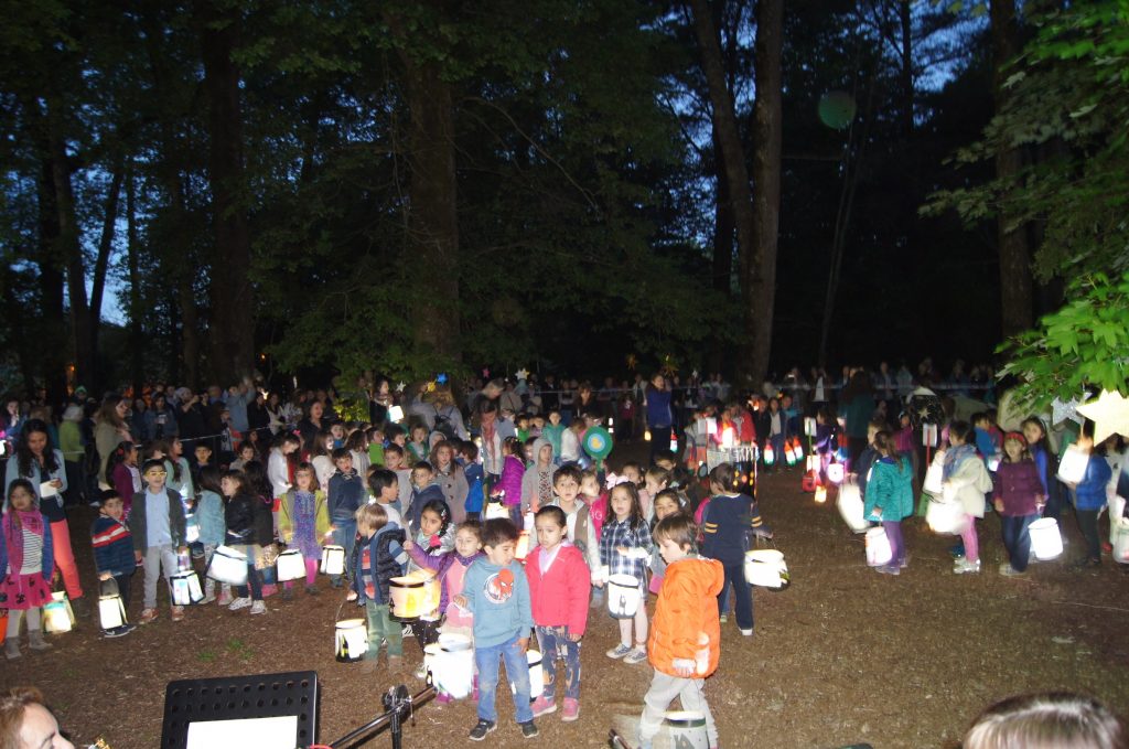 Las profesoras Rosita Sandoval y Nicole Gipoulou pusieron el acompañamiento musical para los temas interpretados, y los alumnos dieron una vuelta con sus faroles encendidos, dentro del círculo en que se encontraban.