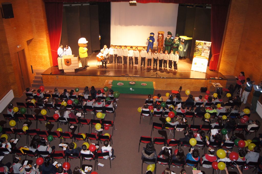 Con todos ellos en el escenario, los niños dieron la bienvenida a Forestín. La Directora de Primer Ciclo Básico, Verónica Martin, lo felicitó y lo saludó, además de su cumpleaños, por la inmensa e importante labor que realiza CONAF en el cuidado de nuestro medio ambiente y de los bosques del país.
