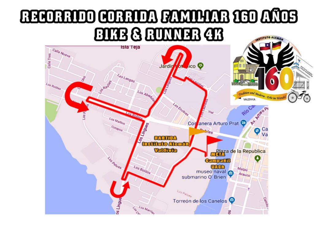 La actividad se realizará el sábado 24, y comienza con un calentamiento previo de zumba a las 11:00 hrs., frente a la entrada principal de nuestro colegio, en el sector del campanil de la Universidad Austral de Chile. La partida es en la misma ubicación al mediodía para realizar un recorrido por la Isla Teja, que se detalla en el mapa.