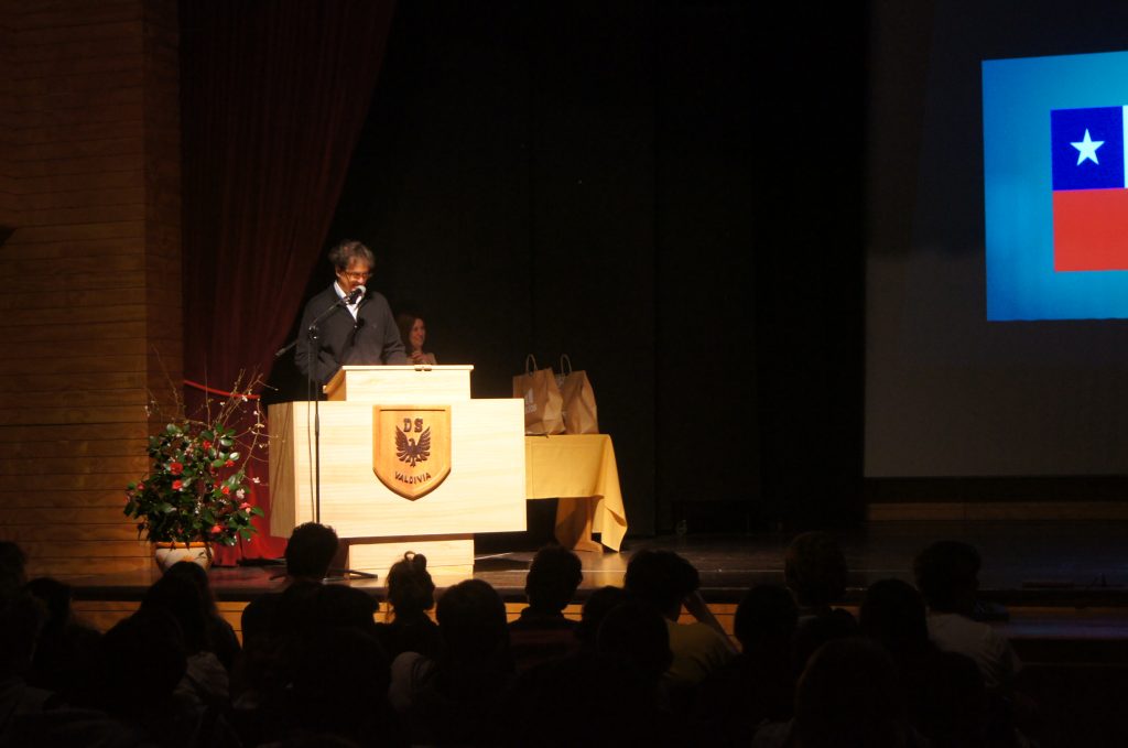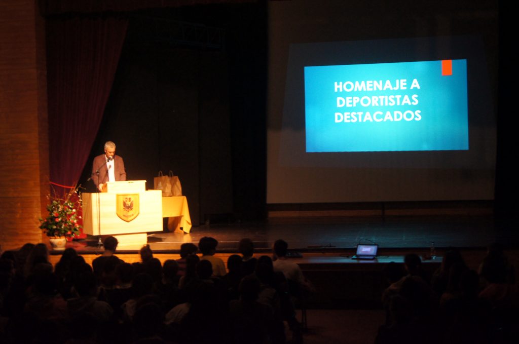 El profesor Marcelo Rojas, Coordinador de Actividades Extraprogramáticas Deportivas, ofició como presentador en la ceremonia en la que nuestro Instituto quiso homenajear a la alumna de III B Antonia Liewald Heise, al exalumno Roberto Liewald Heise y a la apoderada Soraya Jadue.