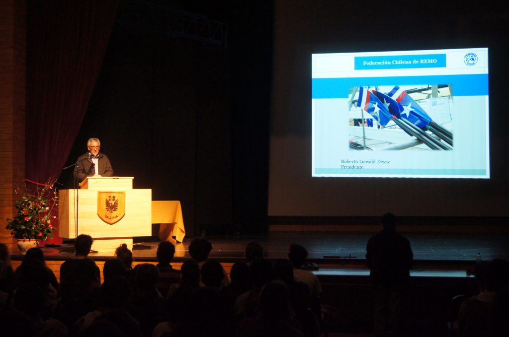 Marcelo Rojas cedió el podio y la palabra al Presidente de la Federación Chilena de Remo, exalumno y apoderado de nuestro Instituto, además de padre de los dos jóvenes remeros, Roberto Liewald, quien agradeció la oportunidad para referirse a este deporte, con una presentación acerca de sus inicios, desarrollo nacional y local, y sueños y proyectos.