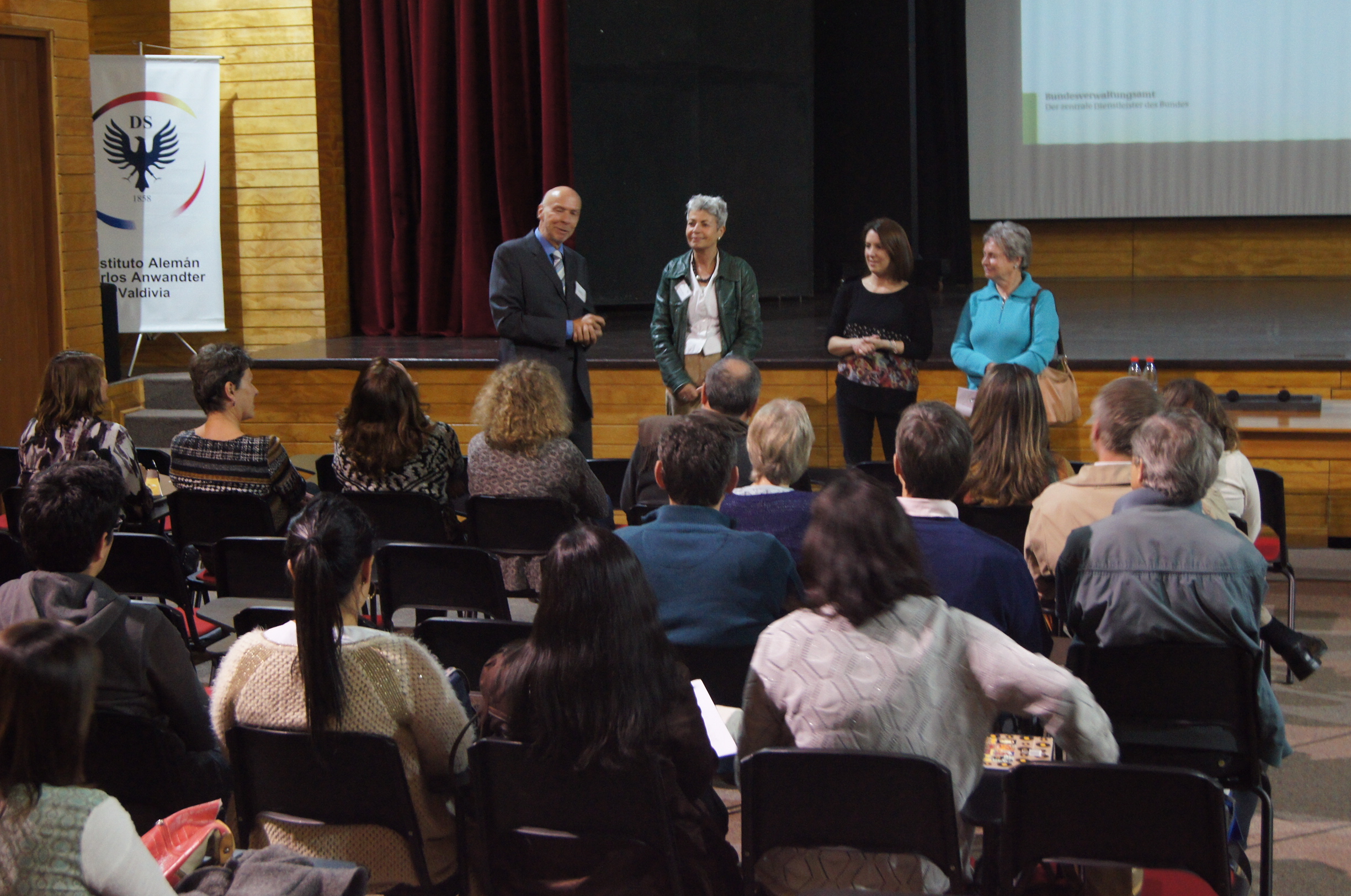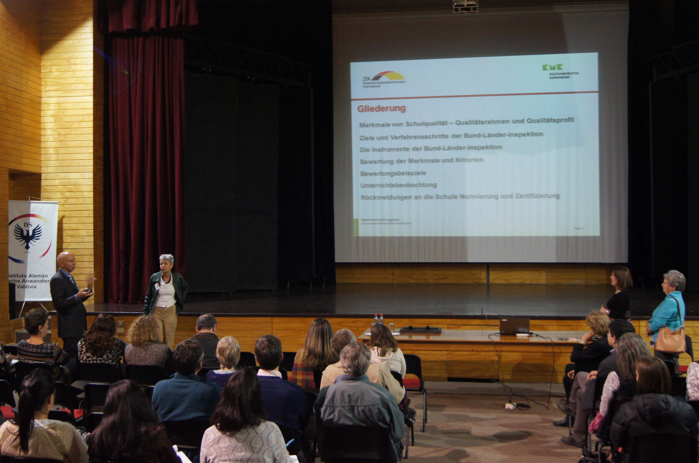 Nuestra Rectora, Liske Salden, presentó a los inspectores y luego de un cordial saludo, ellos mostraron a la comunidad cómo se realizará la inspección esta semana, la forma de trabajo, y detallaron la manera de evaluar, estandarizada para todos los colegios alemanes en el extranjero. Además de las visitas de observación a clases, unas 40 durante la semana, los inspectores se reúnen en entrevistas con representantes de los distintos estamentos del colegio, evalúan la infraestructura (realizado en el recorrido el domingo) y revisan la documentación del colegio, parte de ella enviada a Alemania en mayo pasado.