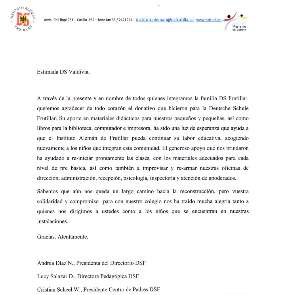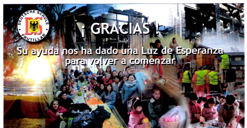 Muy agradecida se manifestó la Directora del Instituto Alemán de Frutillar, Lucy Salazar, el pasado sábado en la Asamblea Anual de Colegios Alemanes de Chile, al agradecer a todos los establecimientos de la red que aportaron con todos los artículos y apoyo para las necesidades más inmediatas, de manera de que su colegio pudiera seguir funcionando luego del incendio.