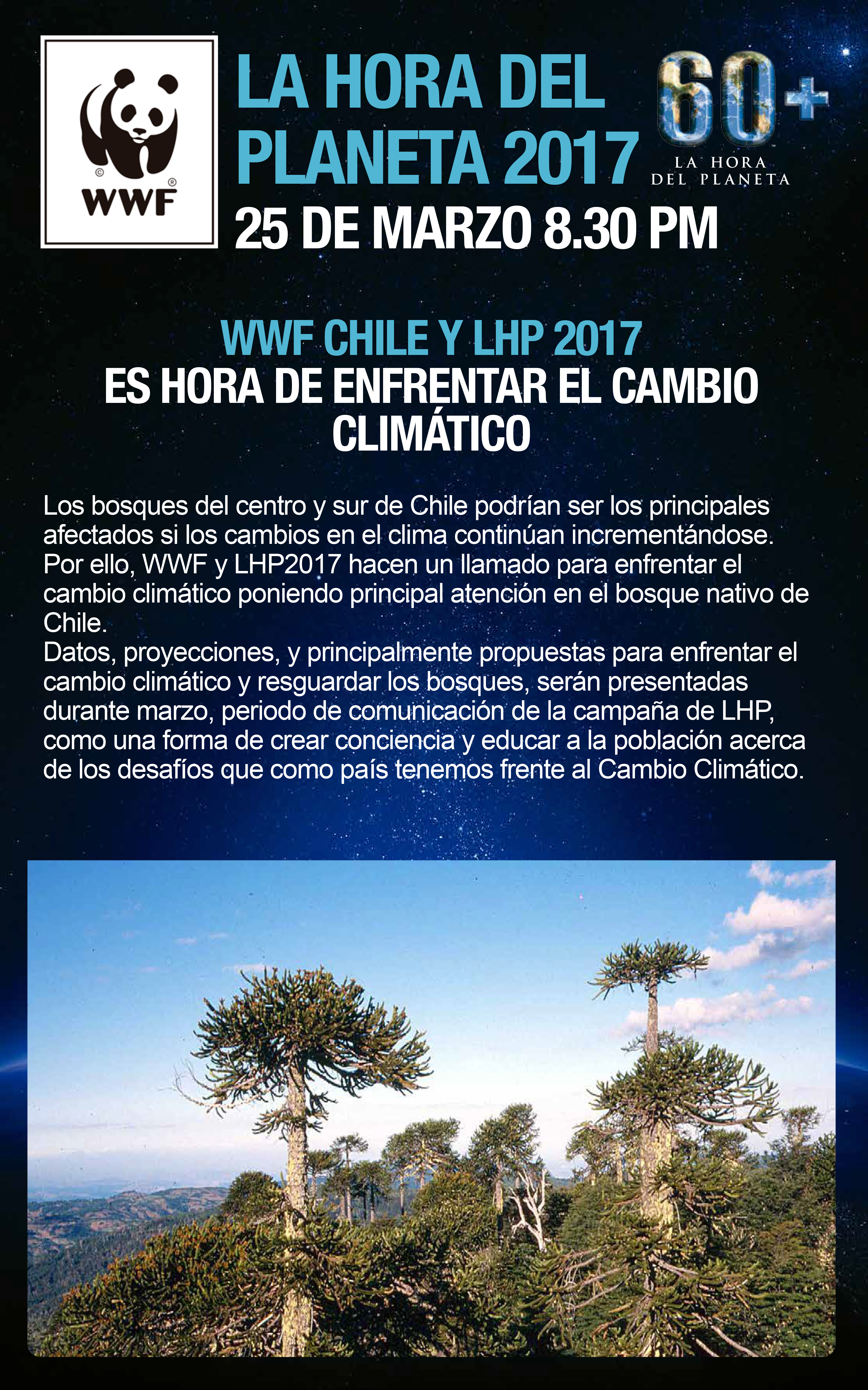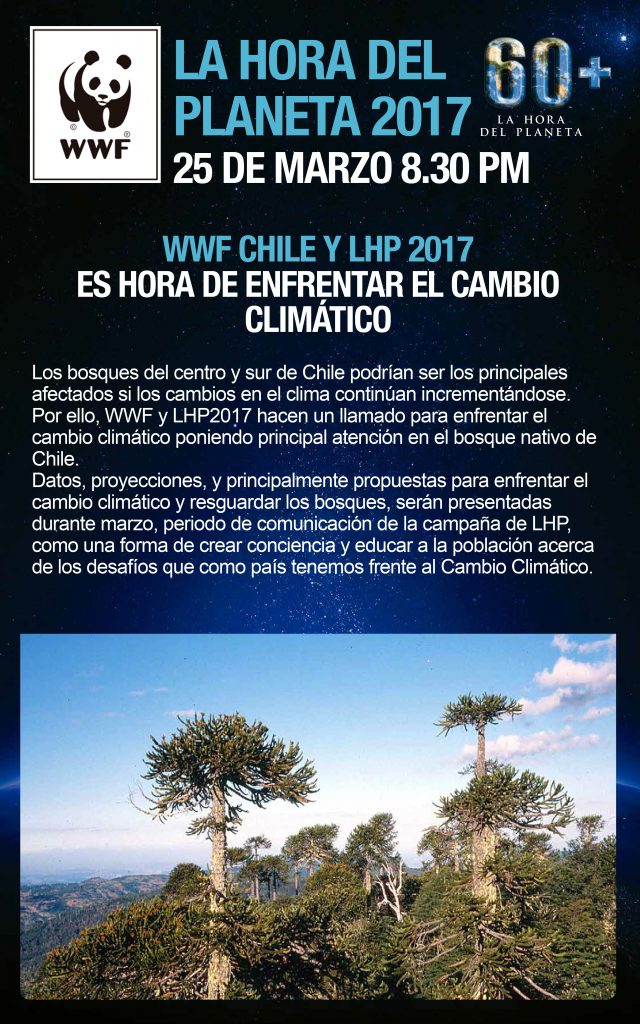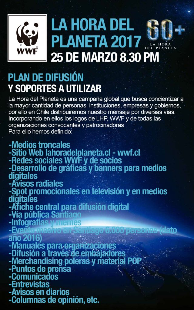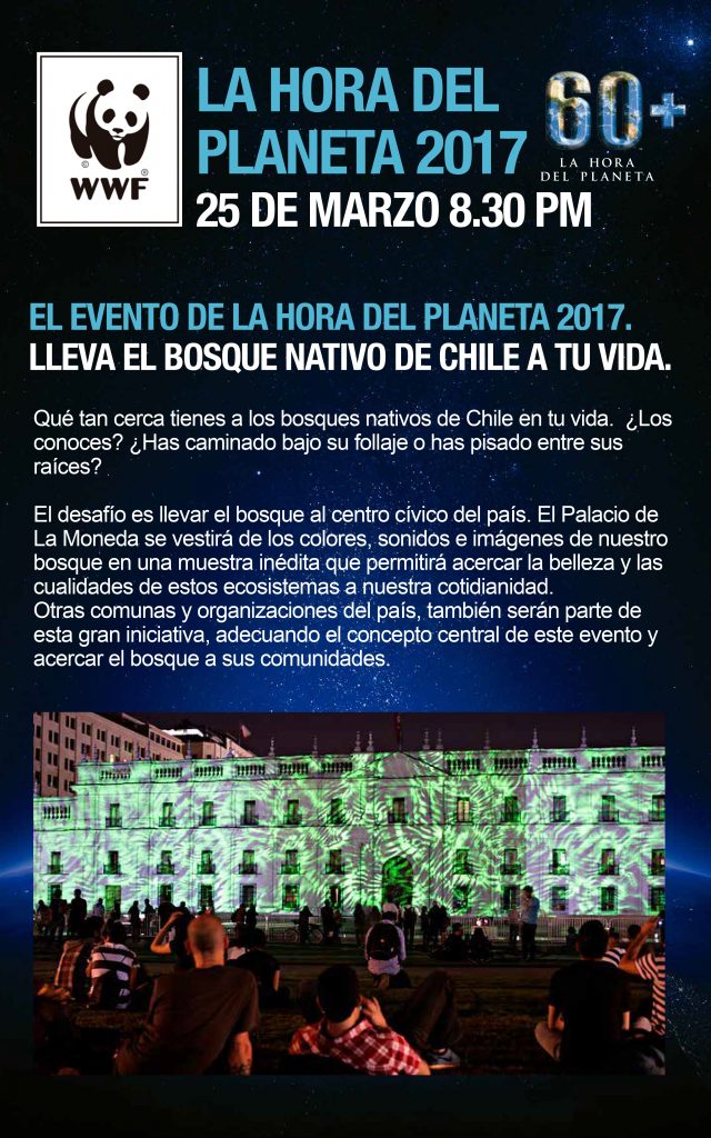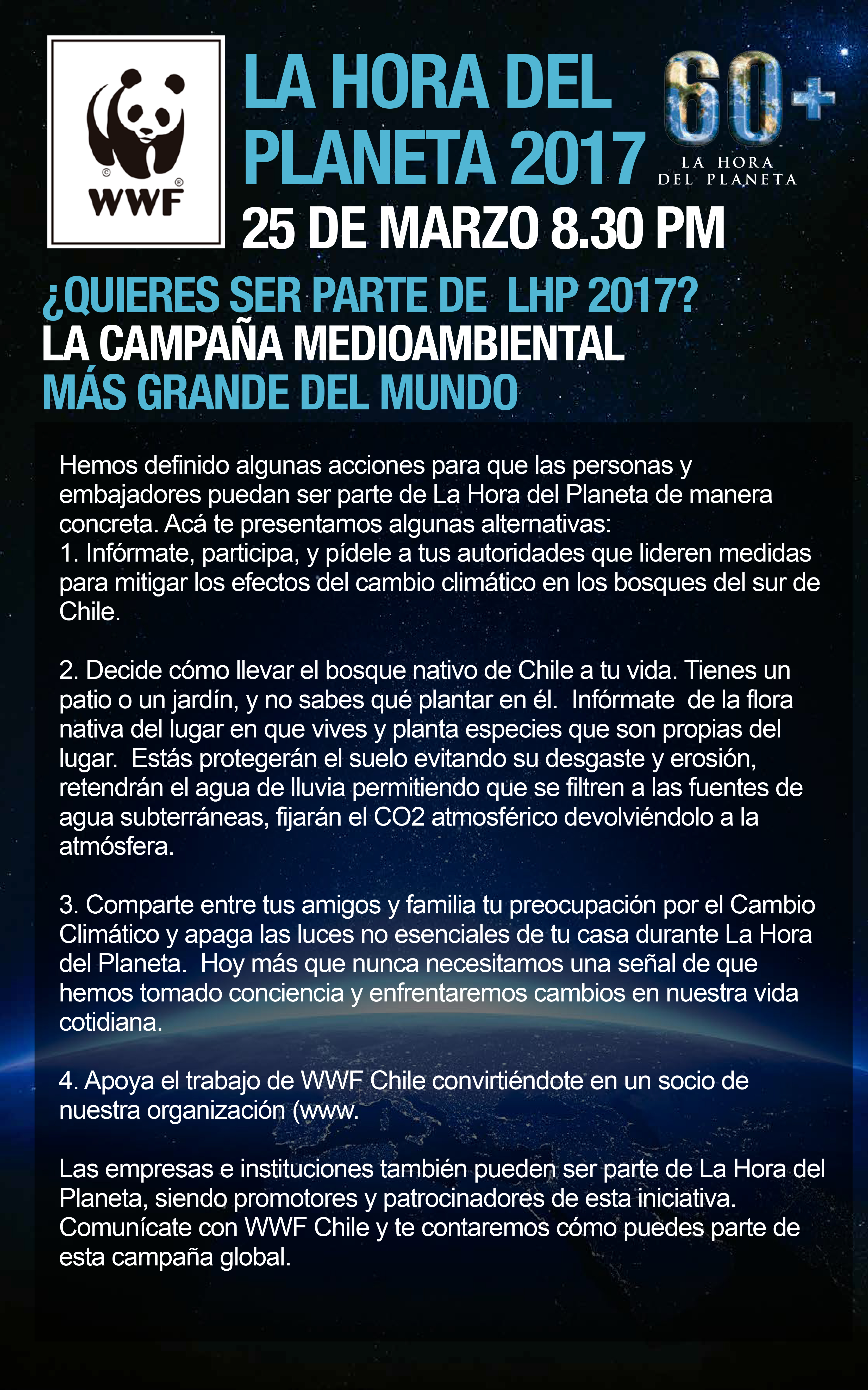 El Fondo Mundial para la Naturaleza, más conocido como WWF por sus siglas en inglés (Worl Wide Fund) hace un llamado a todos quienes deseen colaborar a sumarse a “La hora del planeta” apagando las luces y aparatos eléctricos no esenciales durante una hora, el sábado 25 de marzo a partir de las 20:30 hrs.
