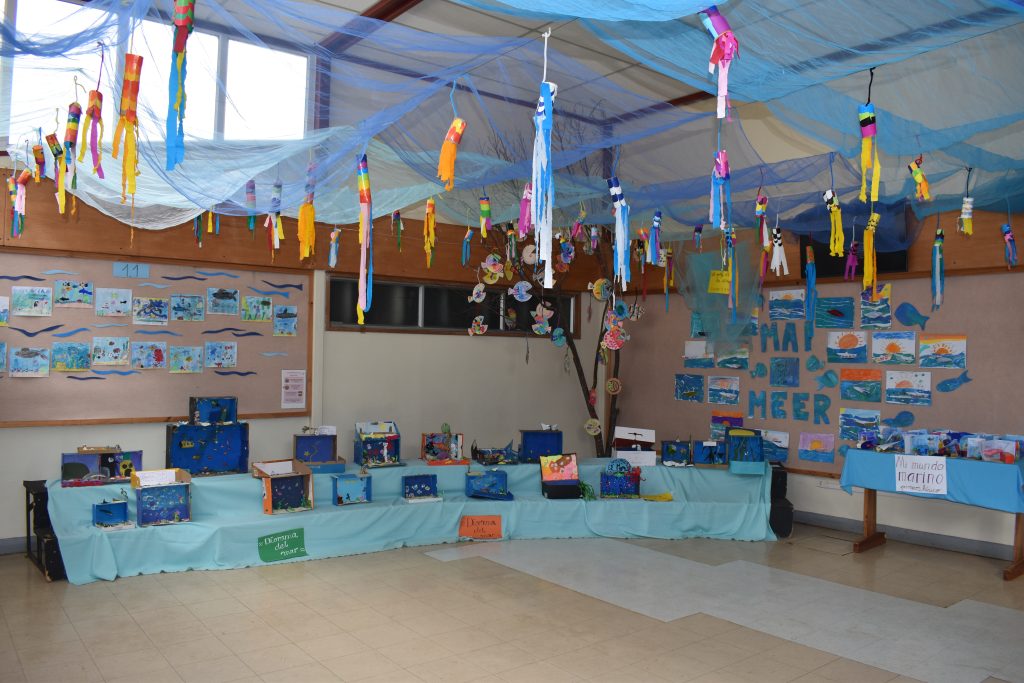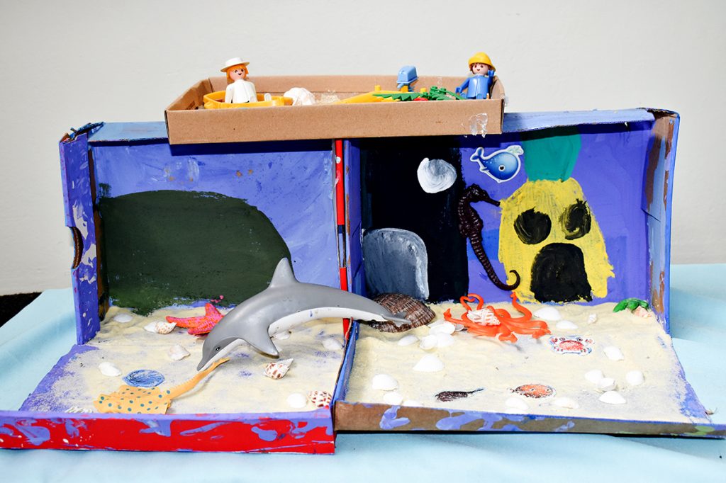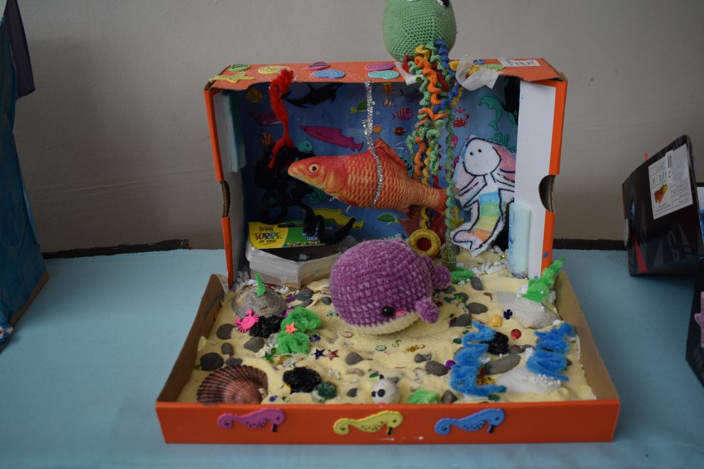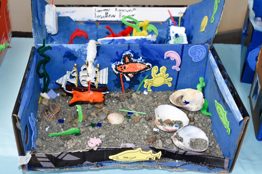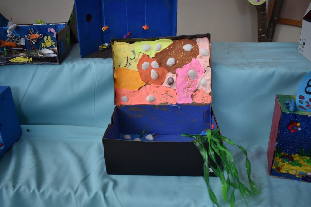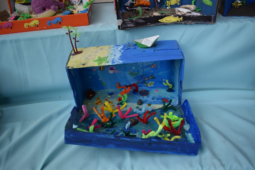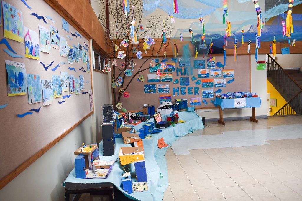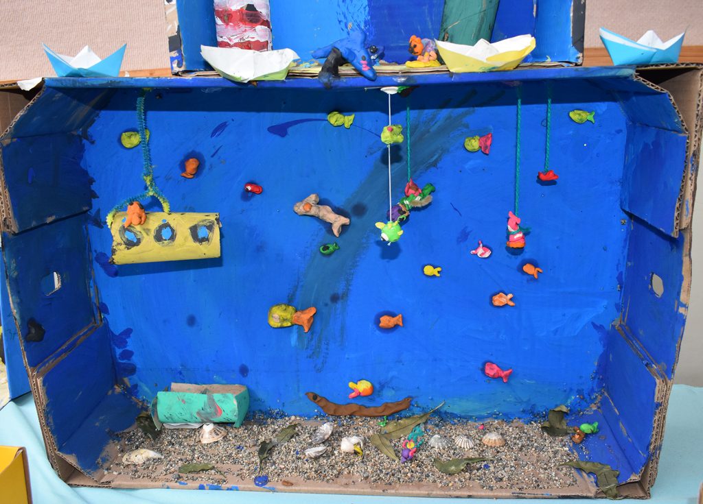 Zu sehen waren unter anderem Pappfische der ersten Klassen, Meeresdioramen und Papierboote der zweiten Klassen, Modellboote und Glücksfische der dritten Klassen sowie Wandteppiche mit Meeres-Silhouetten und Unterwassermodelle der vierten Klassen.