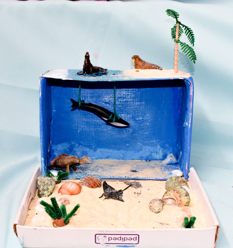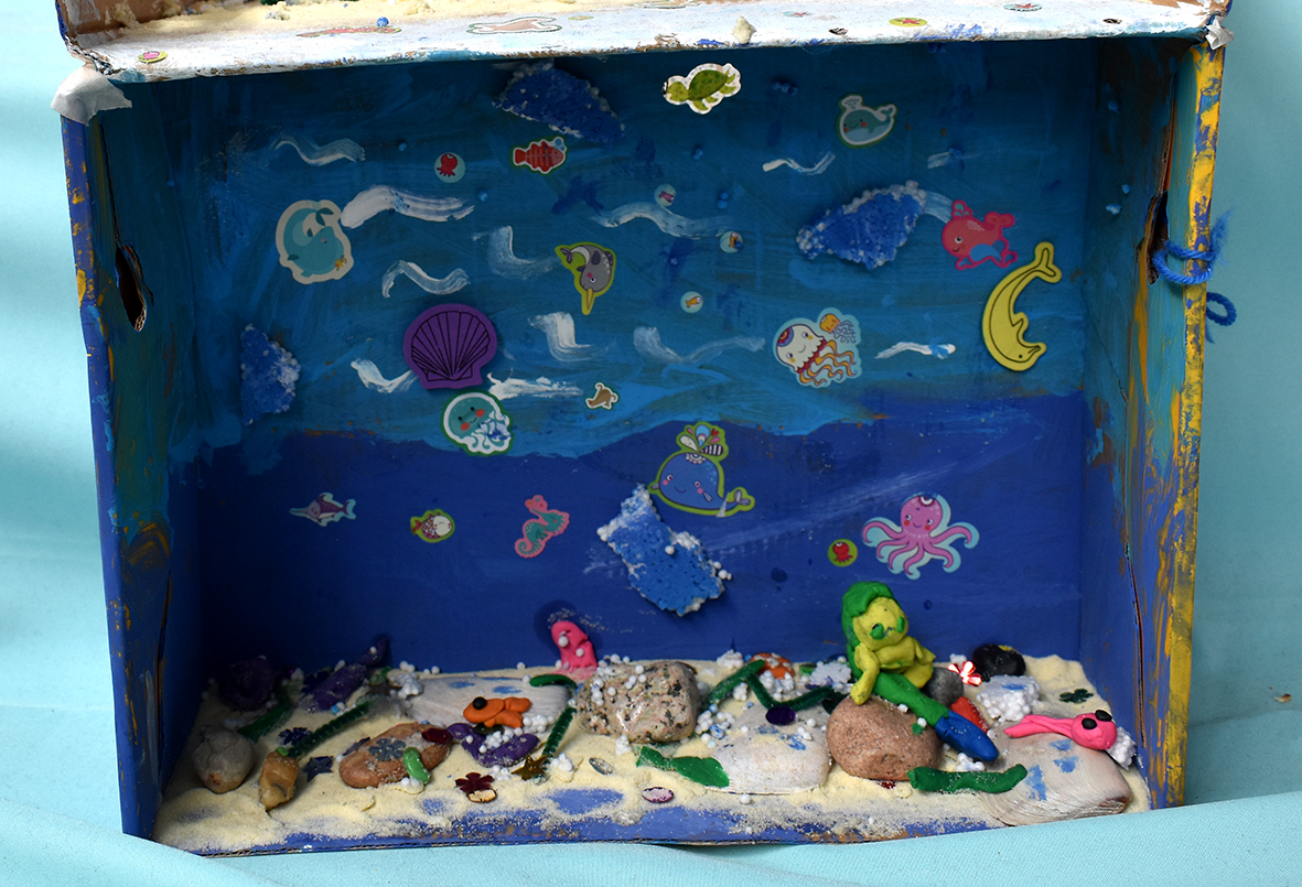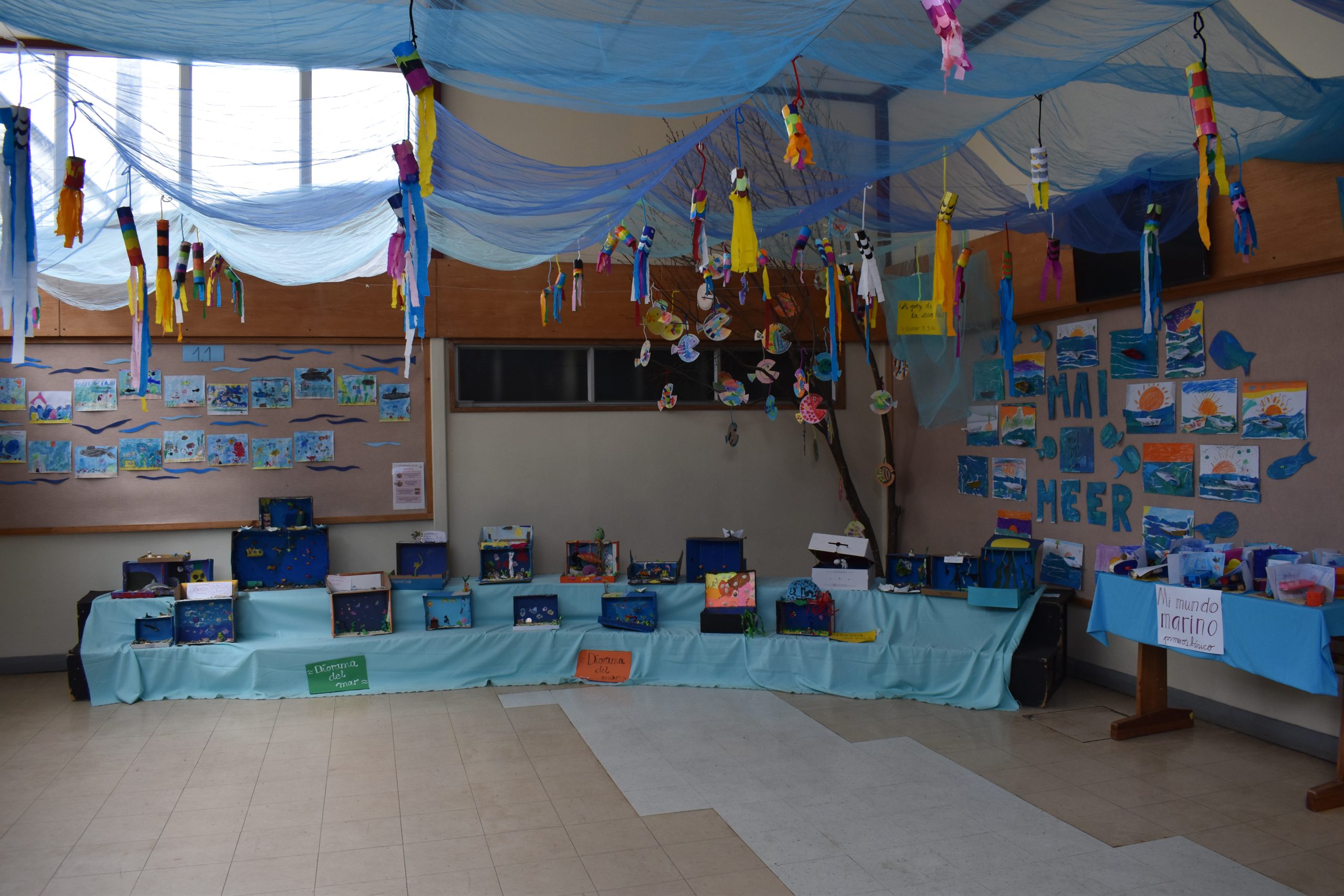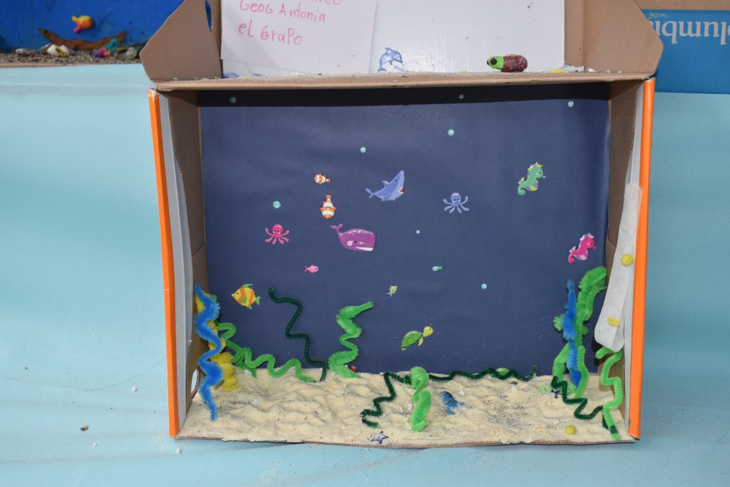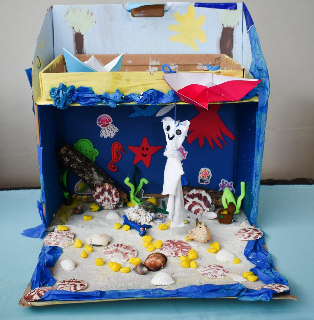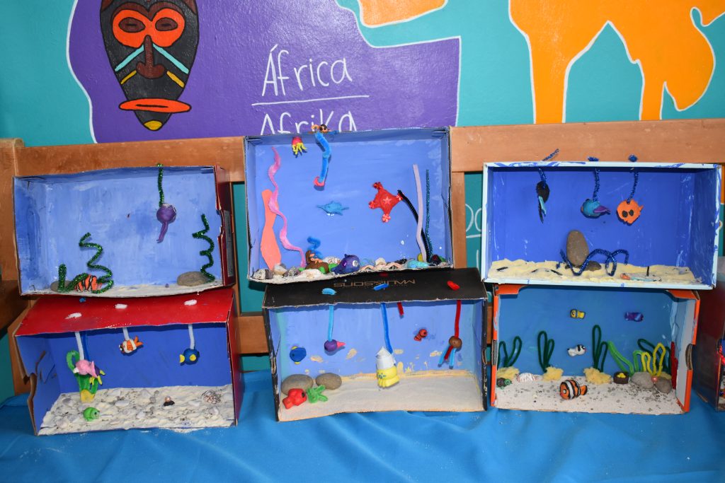 Zu sehen waren unter anderem Pappfische der ersten Klassen, Meeresdioramen und Papierboote der zweiten Klassen, Modellboote und Glücksfische der dritten Klassen sowie Wandteppiche mit Meeres-Silhouetten und Unterwassermodelle der vierten Klassen.